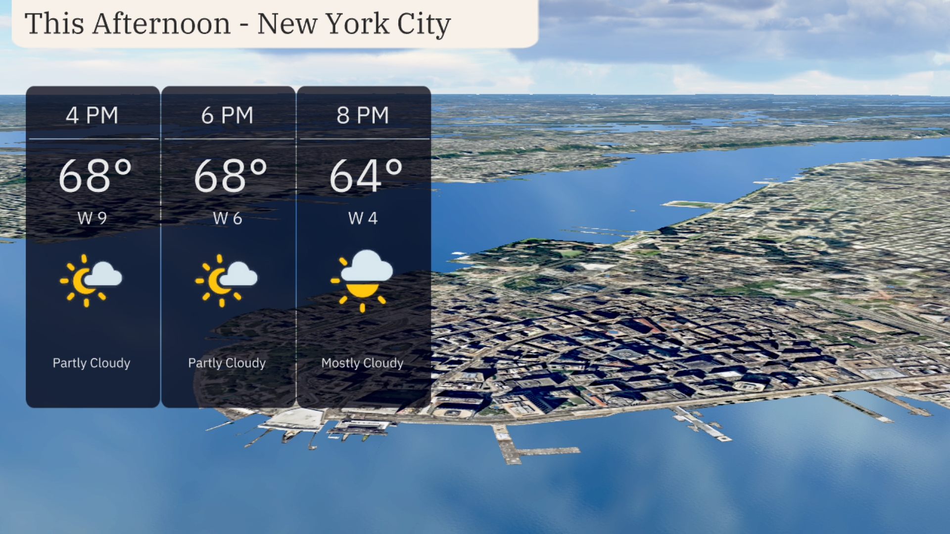 For the afternoon in New York City, temperatures will hold steady at 68 degrees with a west wind at 9 miles per hour. Expect partly cloudy skies to transition to mostly cloudy by 8 PM. The gentle breeze and rising cloud cover will provide a cozy late afternoon vibe.