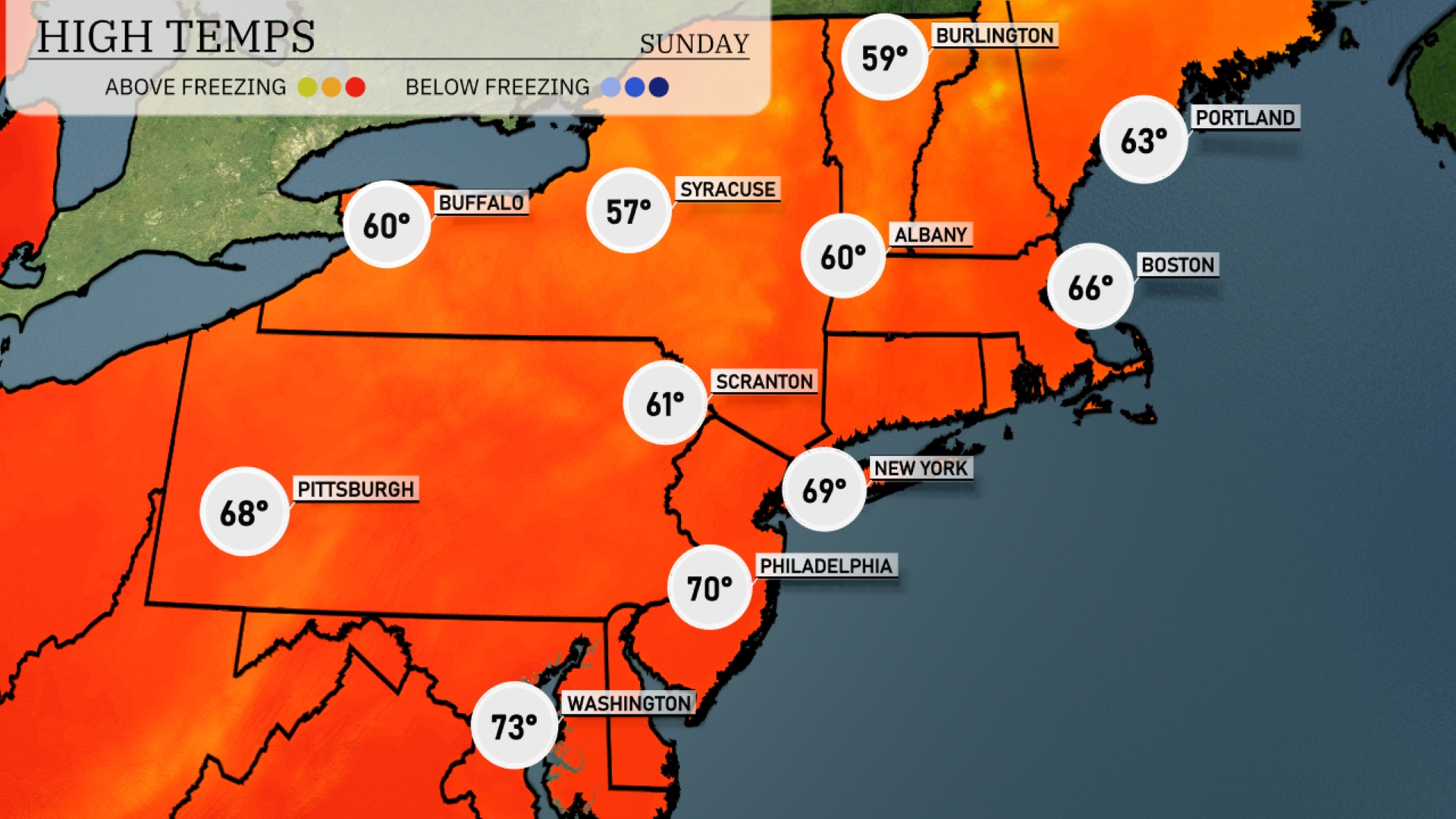 Today in Philadelphia, we’re looking at a high of 70 degrees, while New York City will reach 69. Further north, Boston will see a high of 66 degrees, and Albany is slightly cooler at 60. Syracuse will stay on the chilly side with a high of just 57 degrees, and Buffalo hovers around 60. Pittsburgh will be warm at 68 degrees, setting a contrast with the cooler upstate temperatures.