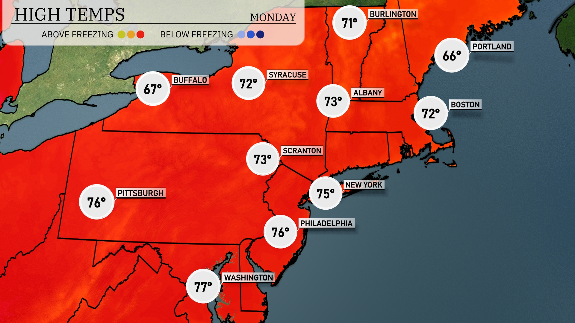 Tomorrow Philadelphia and Washington, D.C. will be warm, both hitting 76 degrees. New York City can expect a comfortable high of 75 degrees, while Albany will warm up to 73 degrees. Buffalo is forecasted for a milder 67 degrees, but still in a pleasant range.