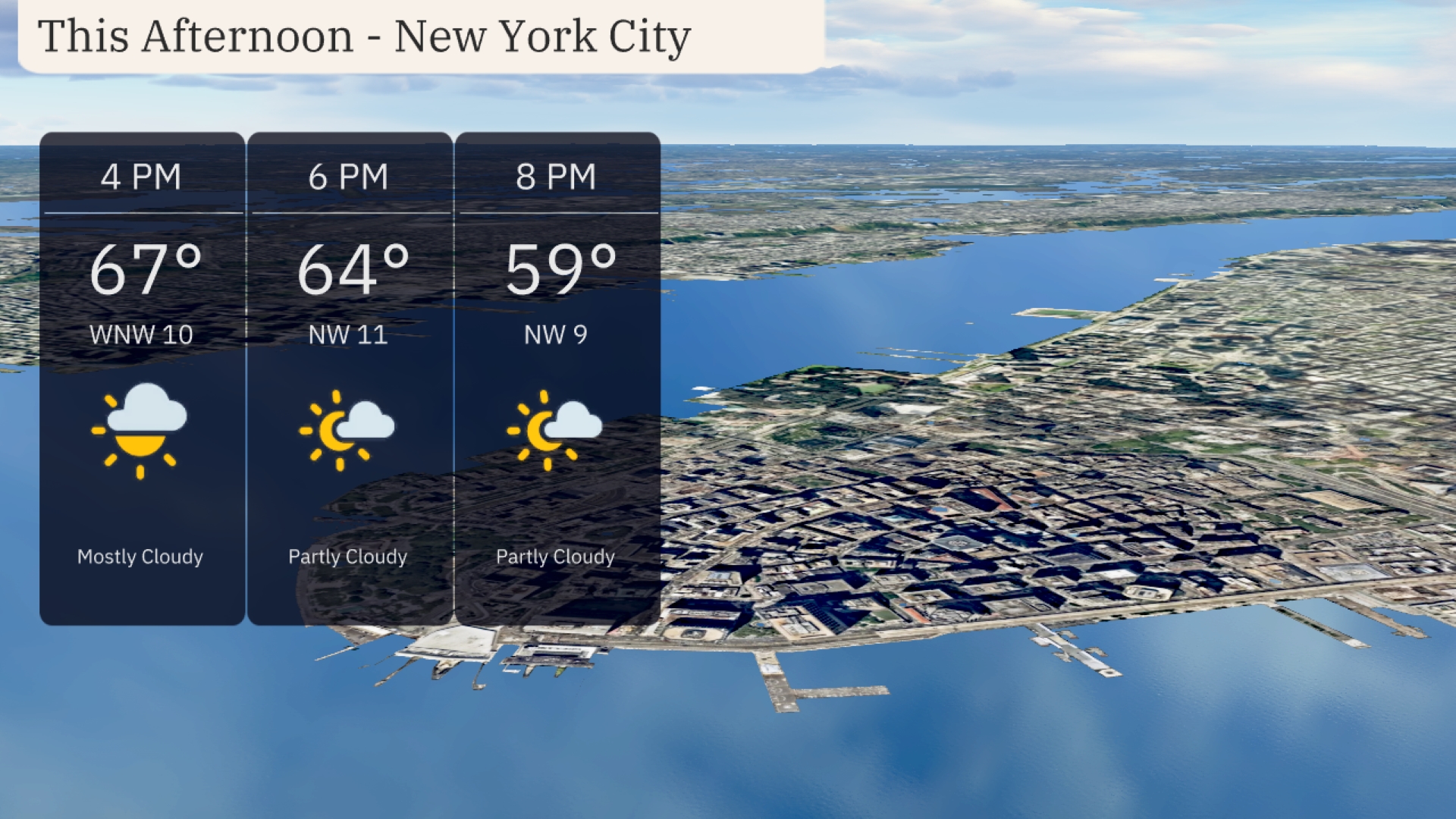 New York City this afternoon will be mostly cloudy with temperatures starting at 67 degrees at 4 PM. Winds will be from the northwest at 10 miles per hour, becoming 11 miles per hour as temperatures dip to 64 degrees by 6 PM. By 8 PM, expect partly cloudy skies with temperatures cooling further to 59 degrees and winds at 9 miles per hour from the northwest.