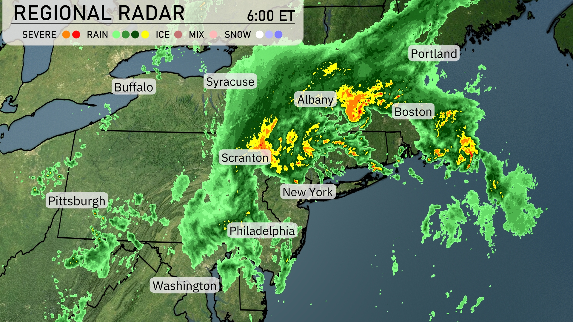 The Northeast is currently experiencing a dynamic weather pattern. Heavy rain with embedded thunderstorms is over Albany and moving toward Boston, creating a wet afternoon for much of eastern New York and southern New England. Scranton and New York City are seeing moderate rainfall, while scattered showers dot the region from Philadelphia up towards Syracuse. Areas around Portland are set to receive a drenching with a steady band of rain passing through. Buffalo and Pittsburgh are enjoying a break from precipitation with overcast skies.