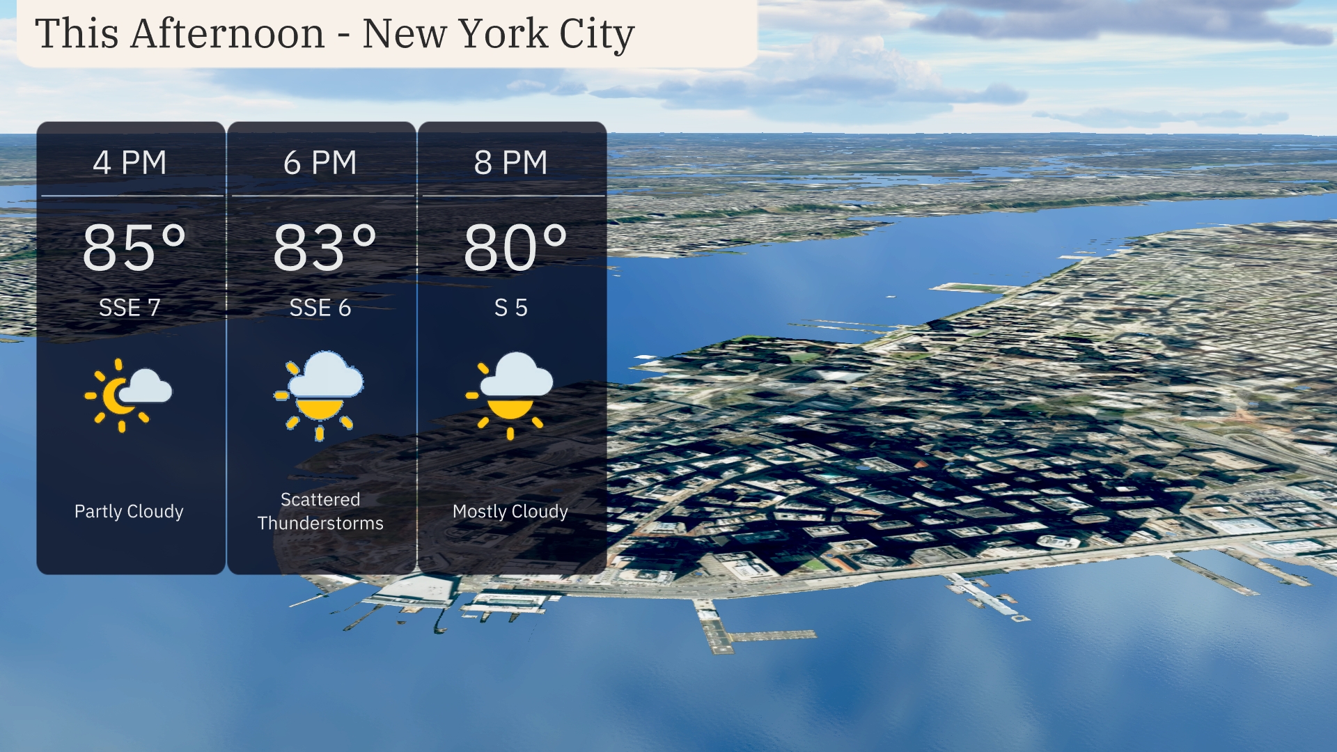 Afternoon in New York City brings partly cloudy skies with temperatures starting at 85 degrees. You can expect winds coming from the south-southeast at 7 mph. By 6 PM, be on the lookout for scattered thunderstorms and a temperature of 83 degrees, with winds decreasing slightly to 6 mph. The evening turns mostly cloudy with a steady temperature of 80 degrees and winds shifting to the south at 5 mph.