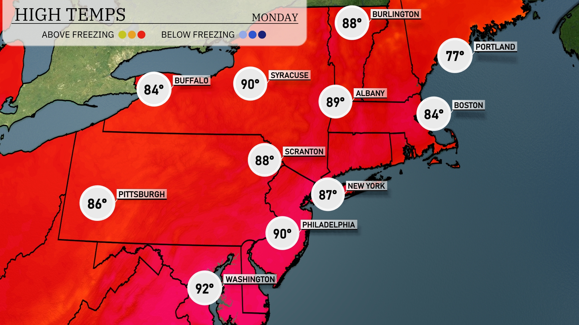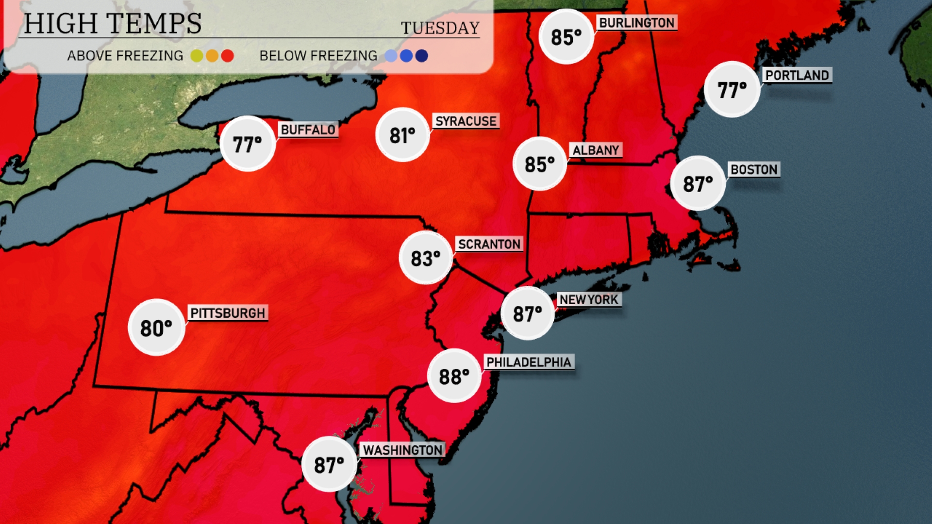 Tomorrow in the Northeast, temperatures will soar with Washington, D.C. reaching a high of 88 degrees. Philadelphia is not far behind at 87 degrees, while New York City warms up to 87 as well. Scranton is set for a comfortable 83 degrees, and Pittsburgh will hit 80 degrees.