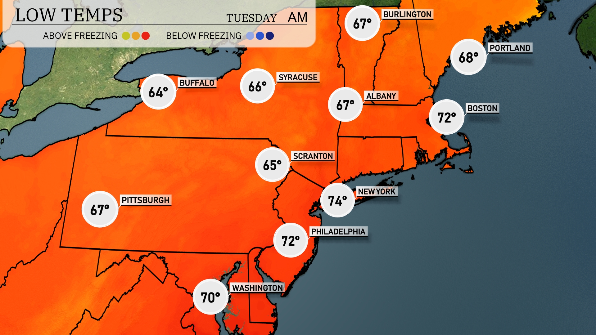 Tonight, Buffalo will cool down to 64 degrees, while Syracuse is expected to drop to 66. Scranton will see a low of 65, and Pittsburgh will settle at 67 degrees. Meanwhile, in New York City, temperatures will remain milder at 74 degrees, with Philadelphia also holding steady at 72.