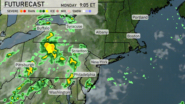 A low-pressure system brings a wave of showers and thunderstorms to the Northeast tomorrow, with the heaviest rain expected across western and central Pennsylvania. Philadelphia and New York will experience scattered showers in the morning, transitioning to heavier rain by the afternoon. Watch for gusty winds and localized flooding in areas with poor drainage. Temperatures will hover in the mid to upper 70s, slightly cooler near the coast. Beyond this, a cold front moves in, clearing the skies and bringing refreshing, cooler air towards evening into Wednesday.
