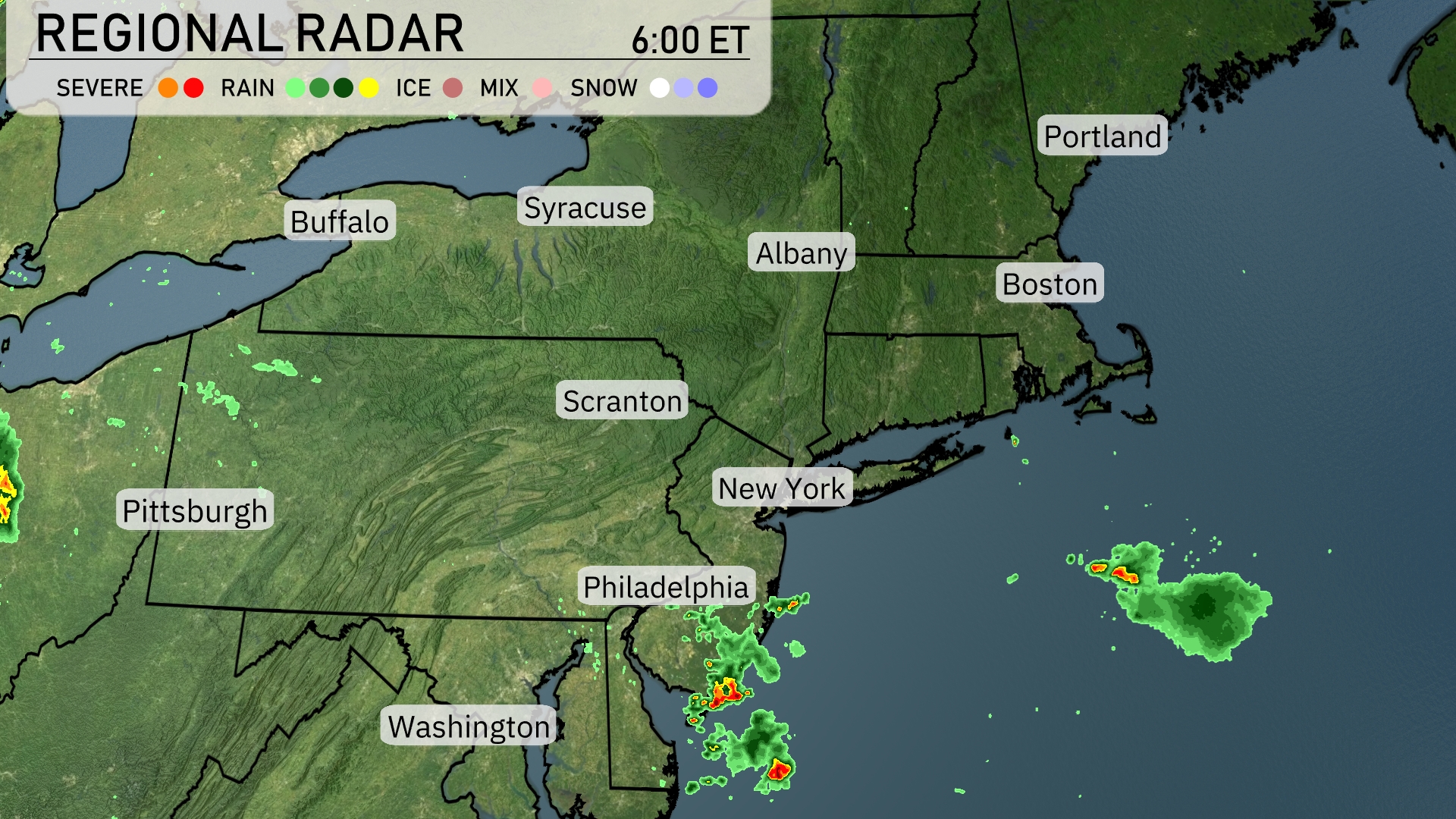 A cluster of thunderstorms is currently developing off the coast, south of New York City and Philadelphia, with rain extending into the Atlantic. Philadelphia and surrounding areas may experience showers as this system moves northeast. Scranton and Albany remain under clear conditions, while some rain showers are expected around the Washington, D.C. area. The rest of the Northeast, including Boston and Portland, is enjoying clear skies.