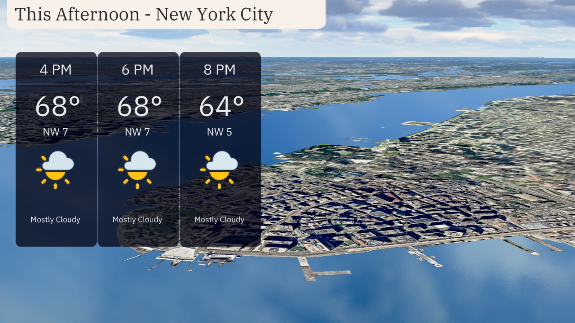 Temperatures in New York City this afternoon will remain steady around 68 degrees, accompanied by a gentle northwest breeze at 7 mph. Mostly cloudy skies will dominate, providing a muted sun-break through the day. As we transition towards evening, expect the temperature to gradually dip to 64 degrees by 8 PM, with the wind slowing to 5 mph, keeping the mostly cloudy theme.