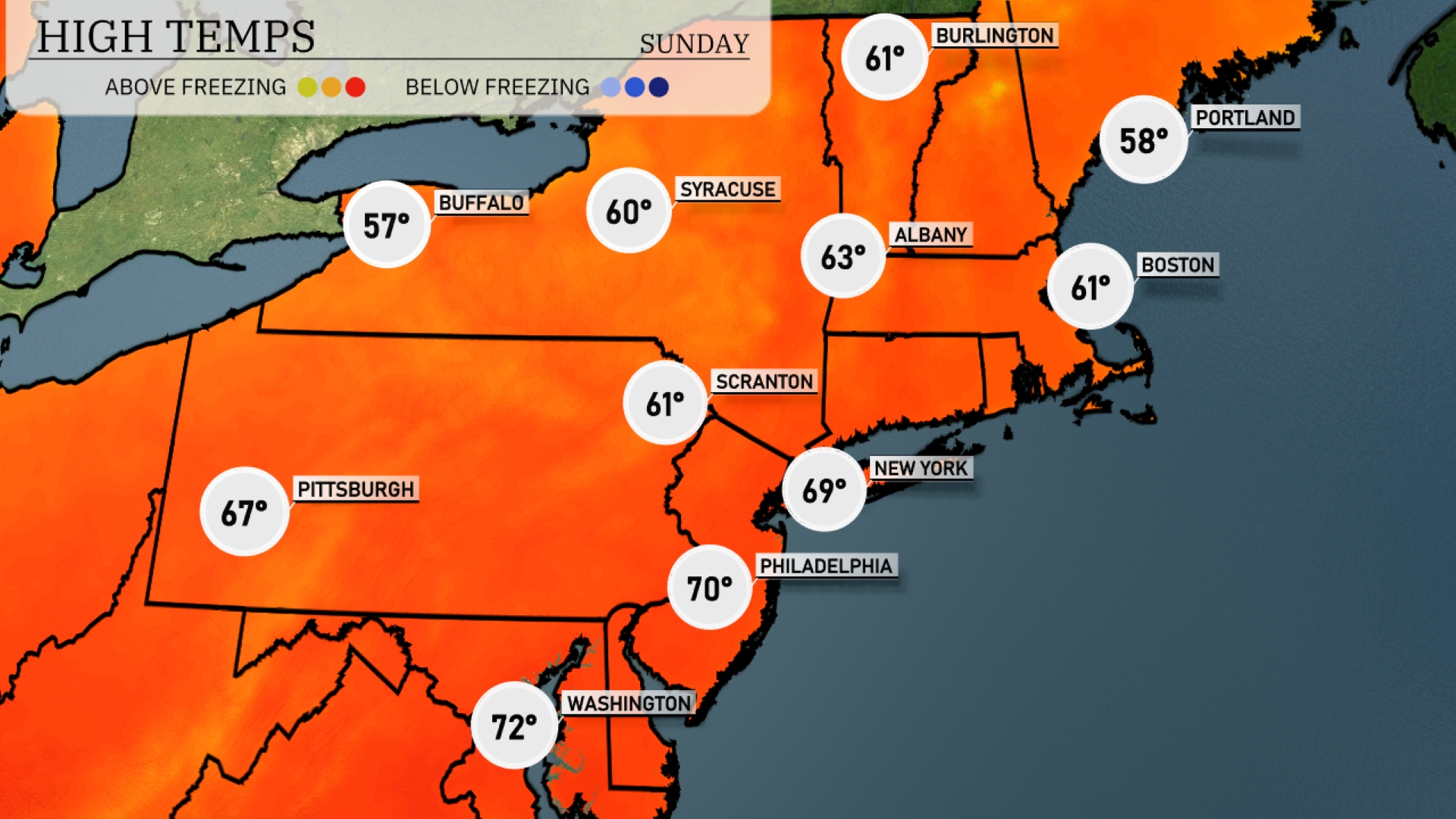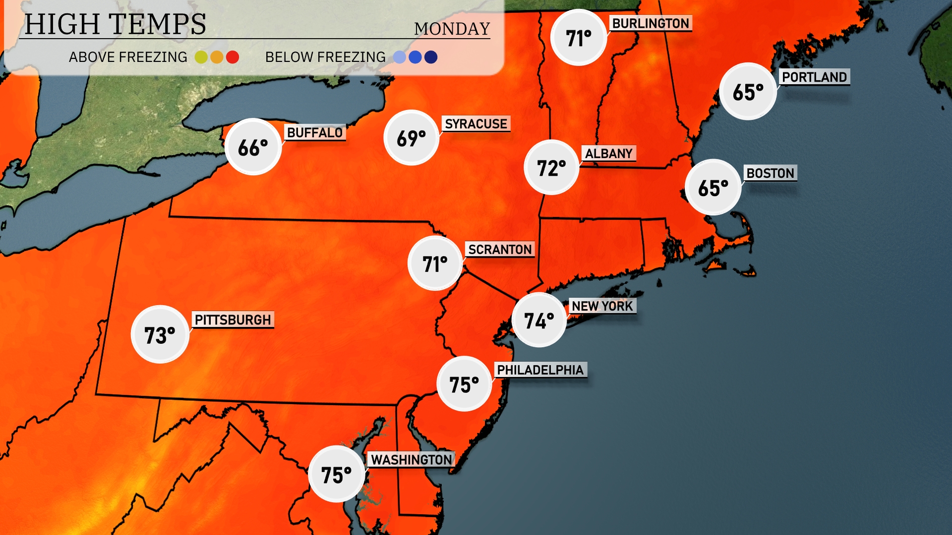 Tomorrow New York City is looking at a warm 74 degrees, while Philadelphia could reach up to 75 degrees. Scranton will see a high around 71 degrees, and Pittsburgh isn’t far behind at 73 degrees. In contrast, Boston and Portland will be cooler, both hitting 65 degrees. Syracuse will also remain moderate with a high of 69 degrees.