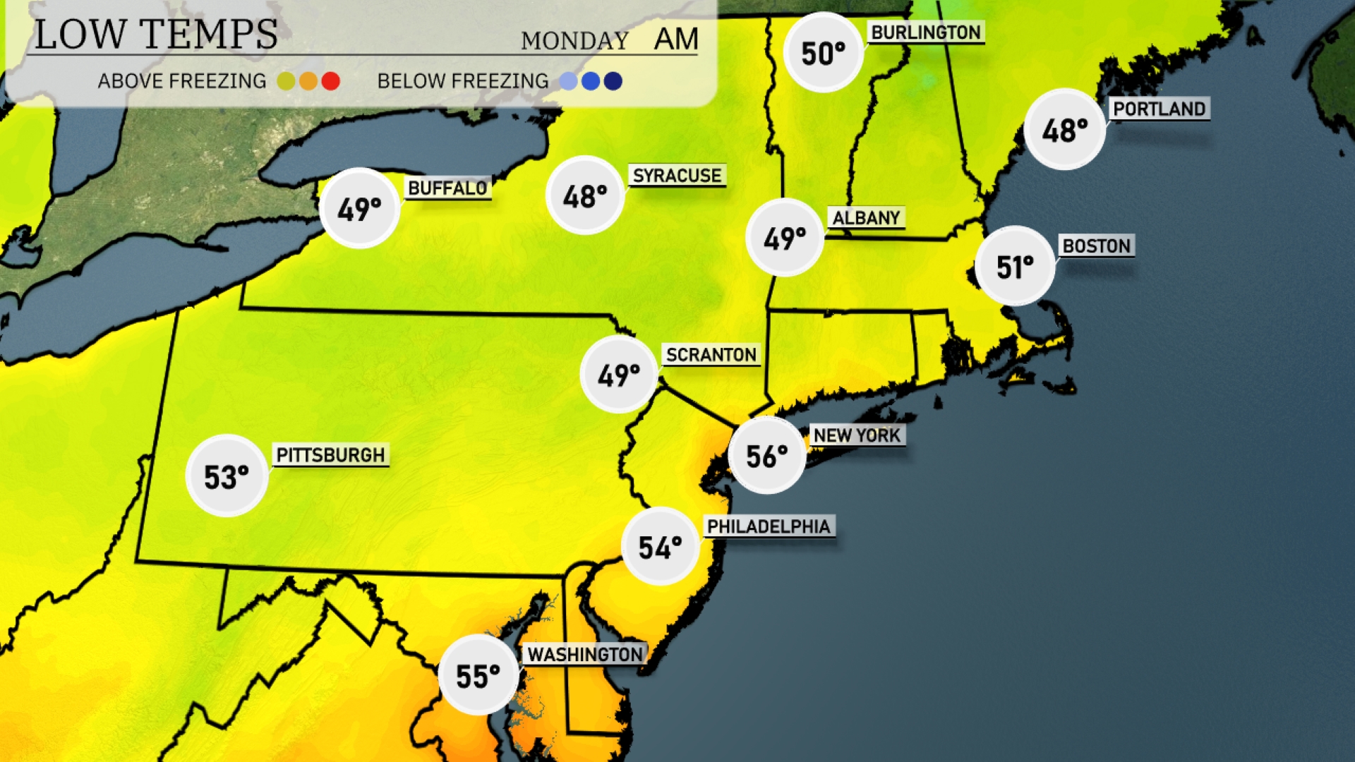 Tonight Buffalo and Syracuse are expected to drop to 49 and 48 degrees, respectively. New York City will see a low of 56 degrees, while Philadelphia will settle at 54 degrees. Pittsburgh will cool down to 53 degrees, and Boston is forecasted to hit 51 degrees. Scranton will also see a low of 49 degrees, establishing a chilly night across the region.