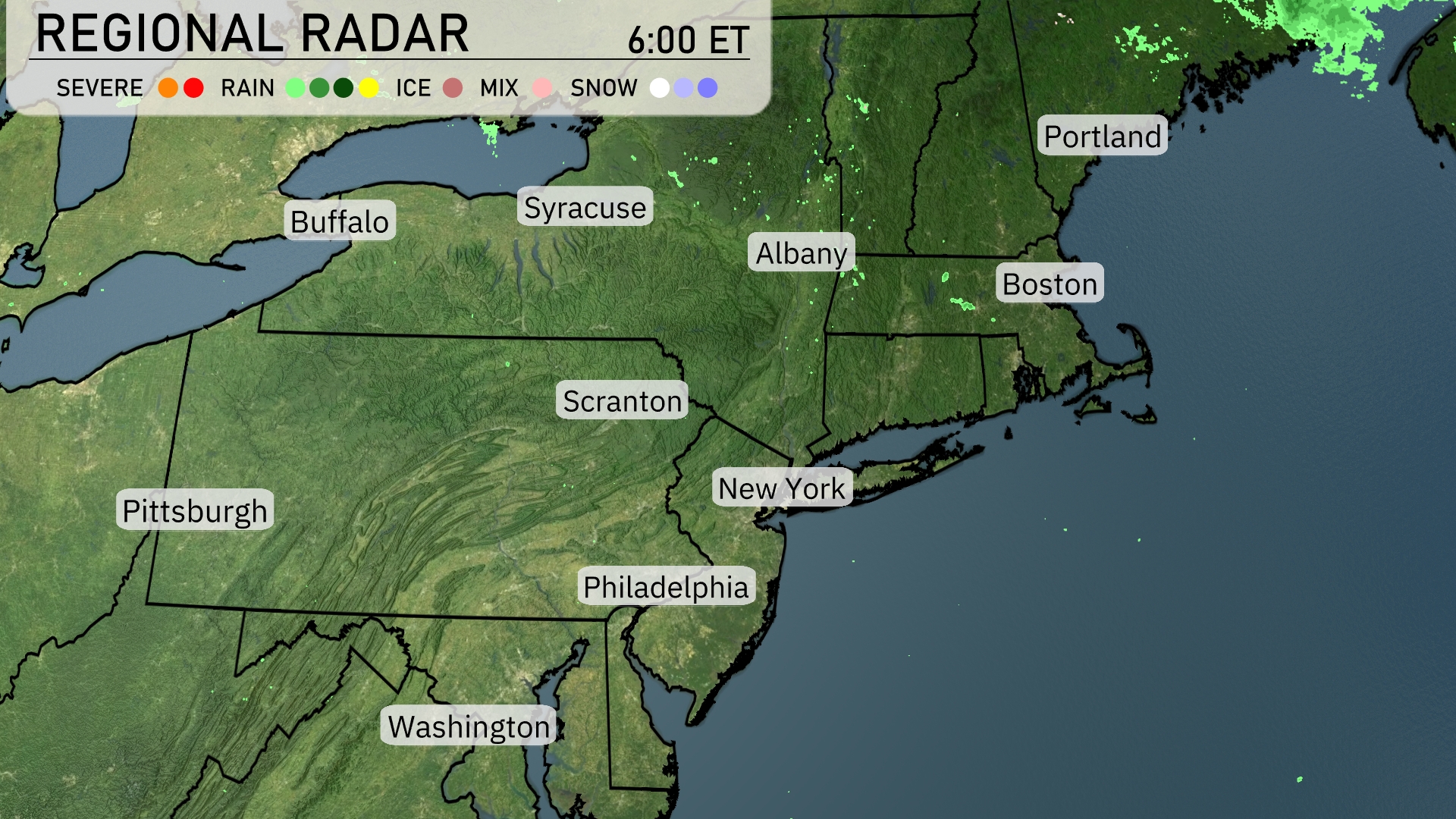 Welcome to our detailed weather rundown with Amy Freeze. This week in NYC, expect a mix of partly cloudy days, sunshine, and a brewing storm. We’ll guide you through calm days and alert you ahead of heavy rains, ensuring you’re prepared whatever the weather. Enjoy the calm before the storm and stay tuned as we move through a varied Northeast forecast, complete with recommendations for each day’s conditions. Over in the Northeast region, the radar shows calm weather dominating much of the area. Albany and Syracuse are under light, scattered precipitation moving southeast. Portland is experiencing the beginnings of these showers, but overall, conditions are rather peaceful. From Boston to New York, the skies remain clear with no significant weather disturbances. Washington and Philadelphia also enjoy tranquil skies, making for a pleasant start to the day.