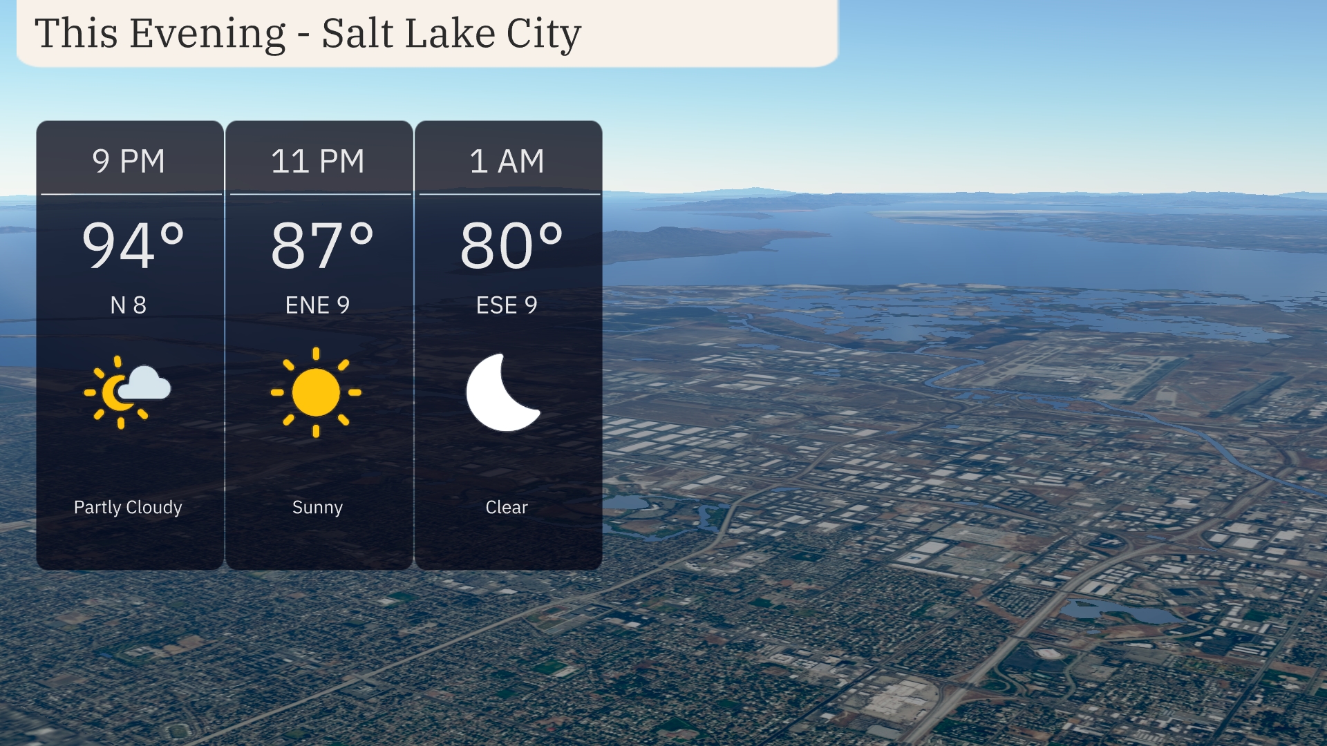 Evening temperatures in Salt Lake City start at 94 degrees at 9 PM with a northerly breeze at 8 mph. By 11 PM, expect 87 degrees with clear skies and a light wind from the east-northeast at 9 mph. As midnight approaches, temperatures dip to 80 degrees under clear skies with an east-southeast wind at 9 mph.