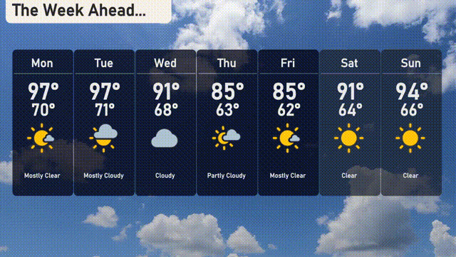 Monday: Expect mostly clear skies with a high of 97 degrees and a low of 70 degrees. Tuesday: It’s going to be another day of mostly cloudy skies, staying warm with a high of 97 degrees and a low of 71 degrees. Wednesday: The clouds take over, cooling slightly with a high of 90 degrees and a low of 68 degrees. Thursday: A mix of sun and clouds, temperatures peak at 85 degrees during the day, cooling down to 63 degrees at night. Friday: Enjoy mostly clear skies and a high of 85 degrees, with a low of 62 degrees. Saturday: Clear skies continue, with the temperature rising to a high of 91 degrees and a low of 64 degrees. Sunday: Clear and sunny to wrap up the week, with a high of 94 degrees and a low of 66 degrees.