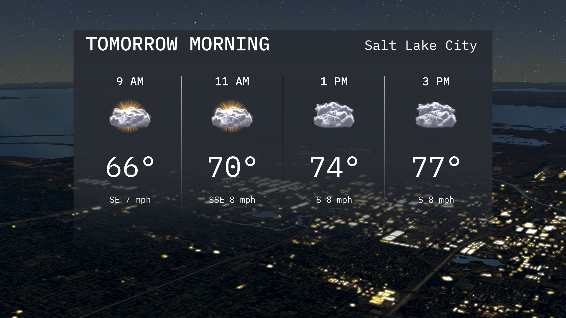 Tomorrow morning in Salt Lake City, expect temperatures to start at 66 degrees at 9 AM with mostly cloudy skies. By 11 AM, it will warm up to 70 degrees as the sun peeks through the clouds. Winds will be gentle, coming from the southeast, creating a pleasant, mild start to the day.