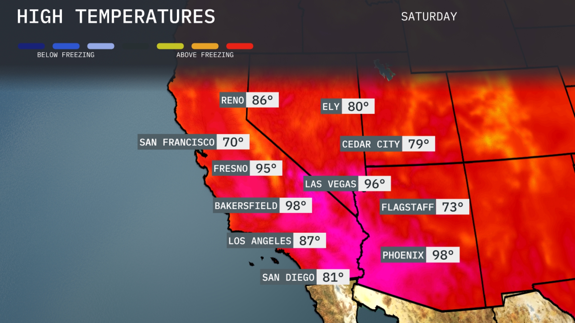 Tomorrow in Phoenix, expect a steamy high of 98 degrees, while Las Vegas warms up to 96 degrees. Bakersfield will sizzle at 98 degrees, and Fresno is set to reach a hot 95 degrees. Los Angeles will enjoy a milder 87 degrees, and San Diego will see a pleasant 81 degrees.