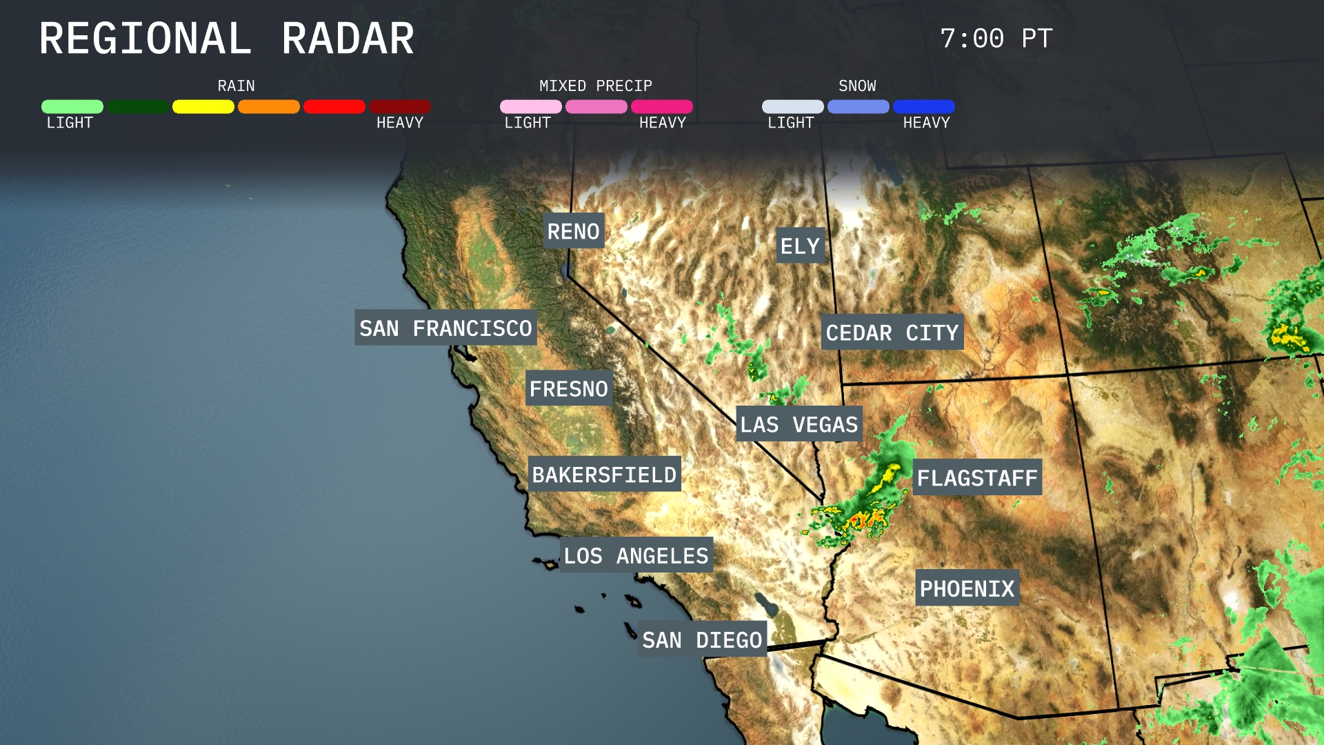 A blend of precipitation types is sweeping across the southwest, with showers impacting the higher terrains around Flagstaff and Cedar City. Reno enjoys clearer skies today. Farther west, San Francisco is clear, allowing for a breeze. A bit of moisture is also present around Phoenix, leading to light isolated showers.