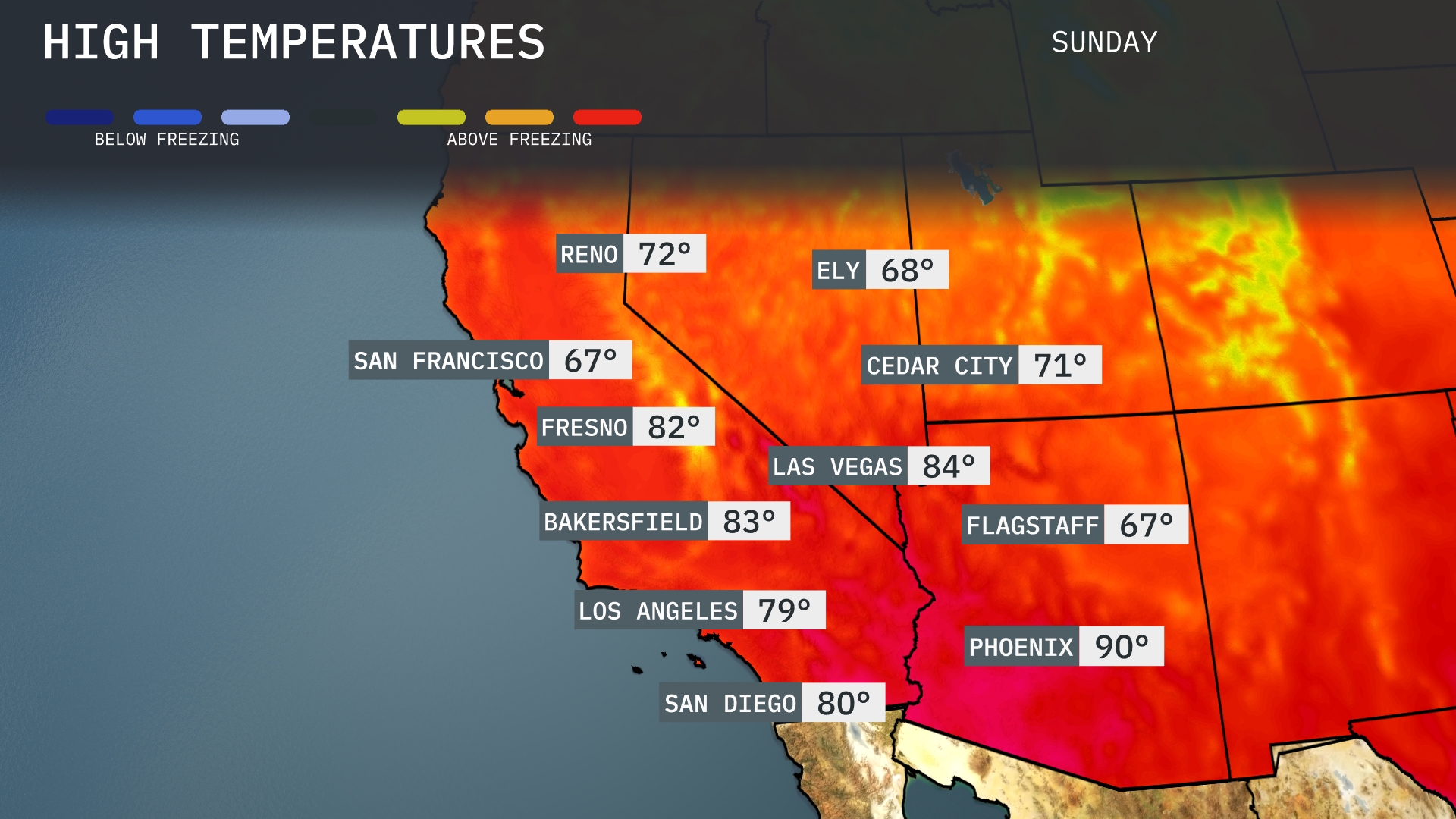 Tomorrow, Phoenix will soar to a hot 90 degrees, signaling an above-average day for this time of year. Las Vegas will follow closely with a high of 84 degrees, while Bakersfield is expected to reach 83 degrees. Los Angeles will see a pleasant high of 79 degrees, maintaining a comfortable trend across the coastline. In contrast, San Francisco will be cooler at 67 degrees, reflecting the typical marine influence in the area. Overall, the Southwest is experiencing notably warm temperatures, typical for mid-October.