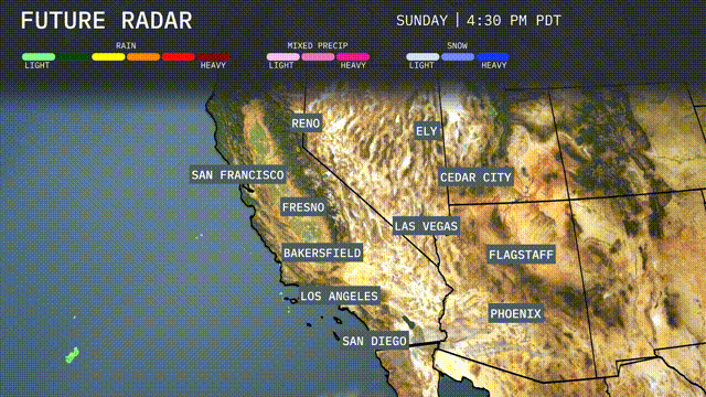 A weather system is bringing heavy mountain snow and valley rain to parts of the Southwest. Northern California, including San Francisco and Reno, will continue to experience significant rainfall, making road conditions challenging through Monday. In the desert regions such as Las Vegas and Phoenix, expect dry and sunny weather, providing a stark contrast to the cooler, wetter conditions in Northern areas. Ely will see snowfall, impacting travel through mountainous regions, while Flagstaff could receive light showers. Los Angeles and San Diego can anticipate a mostly dry and mild start to the week, with potential for scattered showers by midweek.