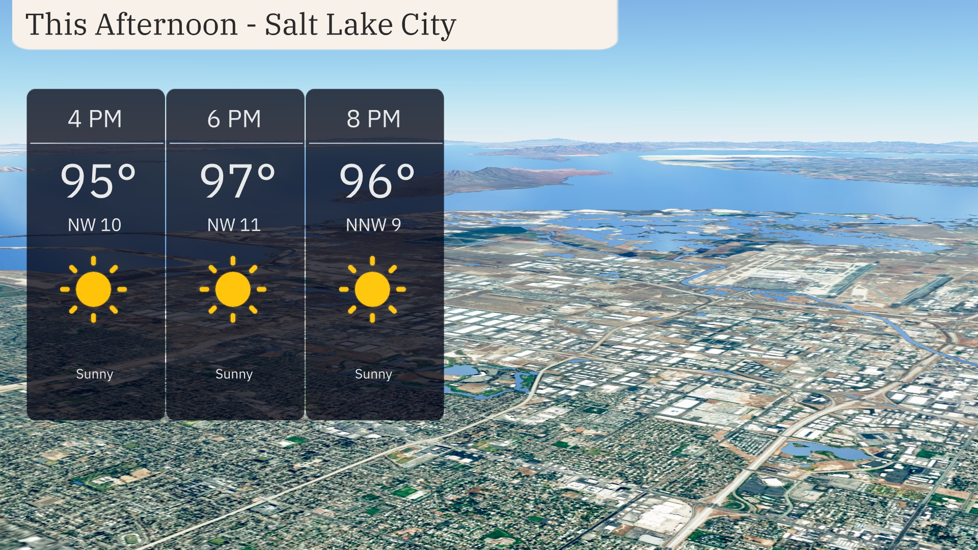 Expect a sunny afternoon in Salt Lake City with temperatures peaking around 97 degrees by 6 PM. Winds from the northwest will be maintaining a gentle presence at about 10 miles per hour throughout the afternoon. The clear skies promise abundant sunshine, making it a warm day ideal for indoor activities to beat the heat. Temperatures will slightly ease to 96 degrees by 8 PM, so stay hydrated and enjoy the summer sunshine!