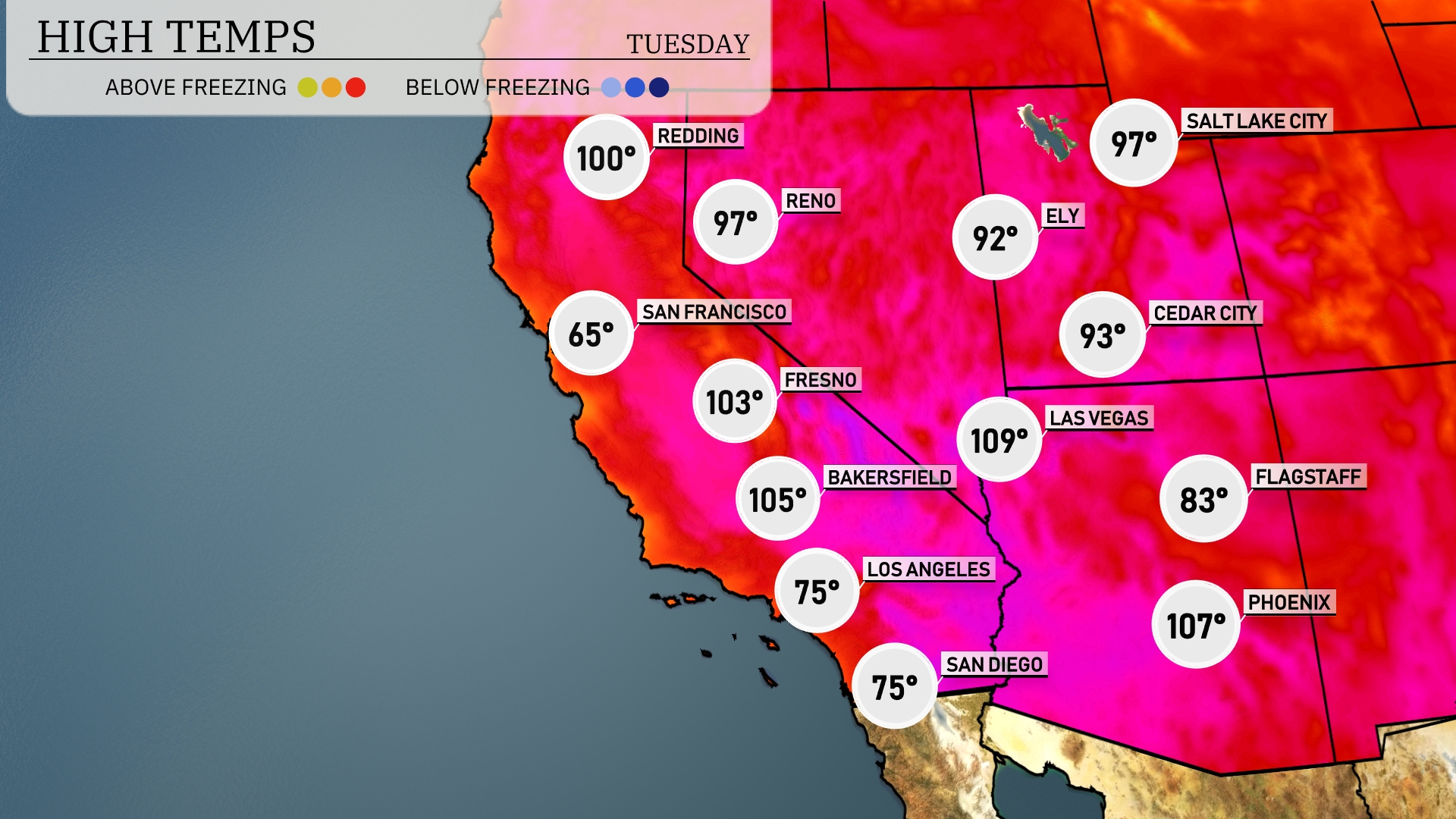 Tonight, low temperatures in the Southwest will drop significantly, with Redding at 68 degrees and San Francisco cooling to 55. Las Vegas is expected to remain warmer at 82 degrees, while nearby Cedar City will see a low of 65. Flagstaff drops to 58, and expect a cool 62 in Los Angeles.