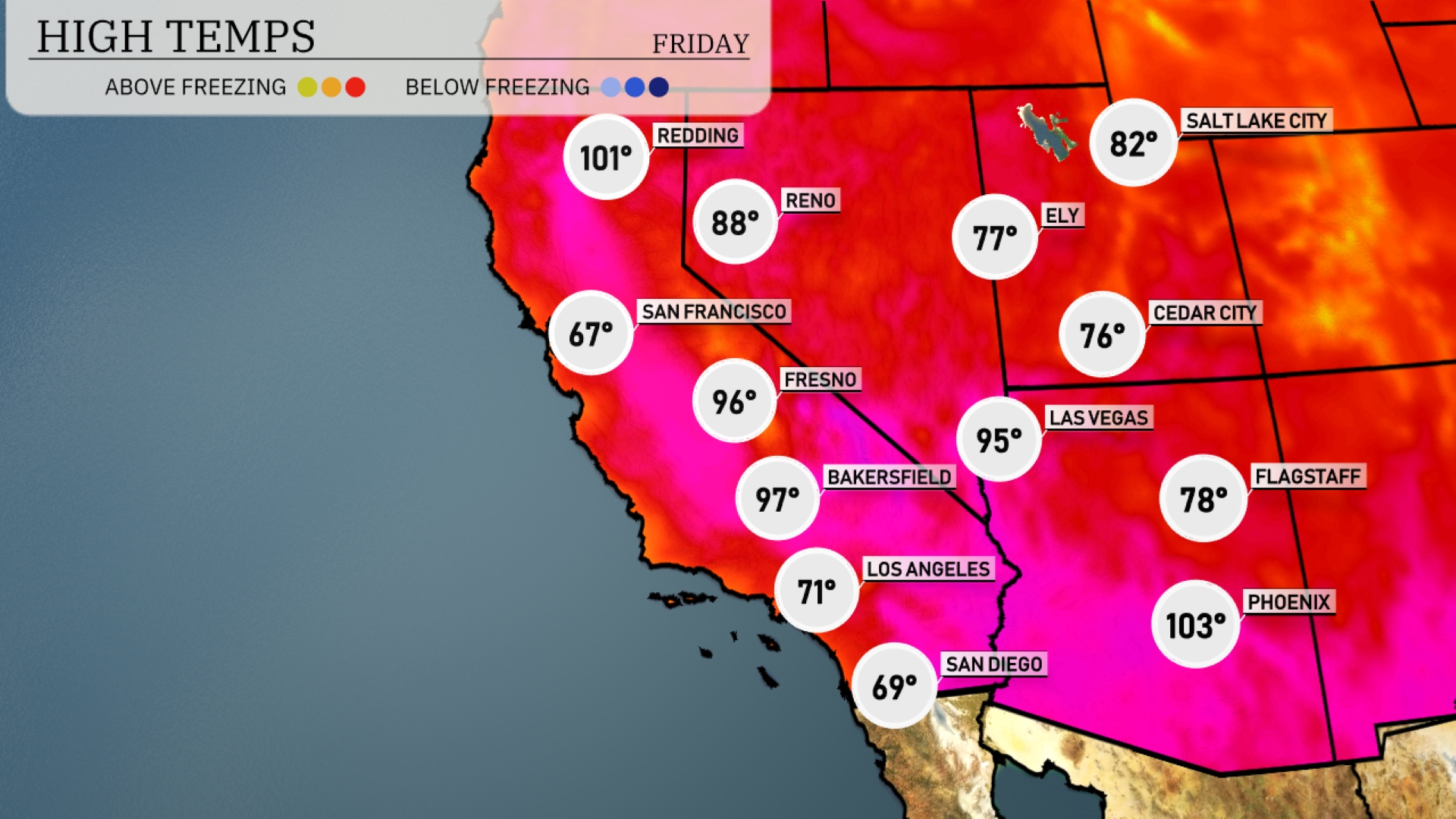 Tomorrow in Phoenix, expect a scorching high of 105 degrees, which is notably above average for this time of year. Las Vegas will also feel the heat with a high of 102 degrees. In Bakersfield, temperatures reach 100 degrees, while Fresno is just a notch below at 99 degrees. San Diego remains cooler at 72 degrees, providing some relief along the coast. San Francisco will see a high of 67 degrees, making it the coolest spot in the region.