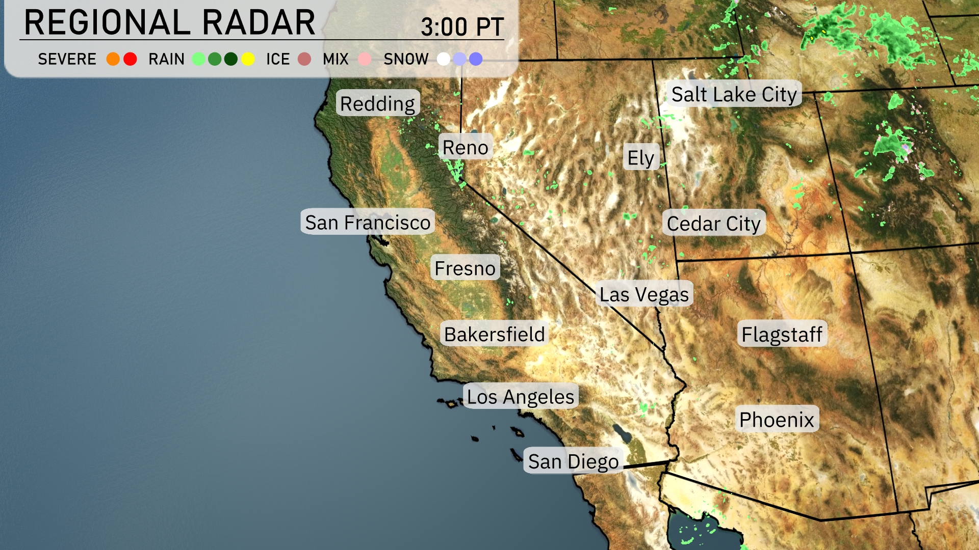 On the Regional Radar for the Southwest, light showers can be spotted around Redding and moving southeast towards Fresno. Around Ely, there are scattered showers but Las Vegas and Los Angeles are currently under clear skies, offering a break from precipitation. Phoenix and Flagstaff remain dry.