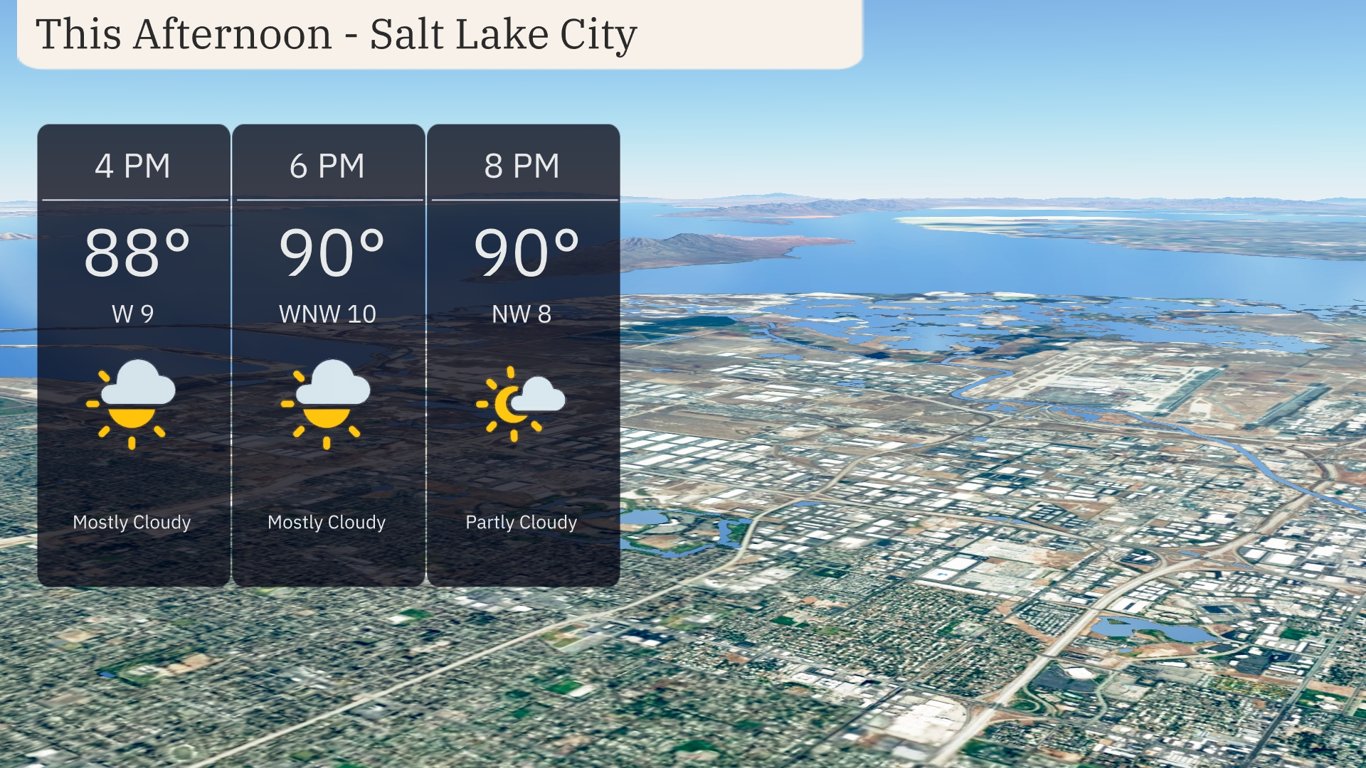 Expect a warm afternoon in Salt Lake City with temperatures reaching up to 90 degrees by 6 PM. Winds will be coming from the west-northwest at 10 mph, providing a subtle breeze. The sky will remain mostly cloudy throughout the afternoon, with a slight clearing toward the evening as clouds start to part.