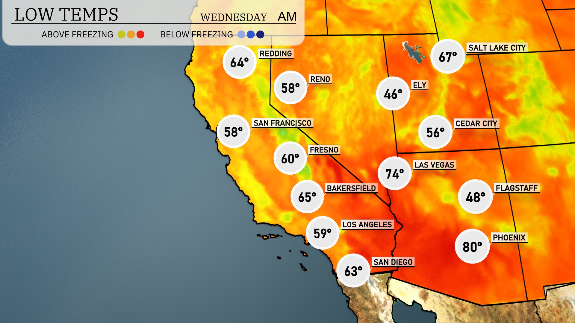 Tonight, temperatures in the Southwest region will drop significantly. Flagstaff can expect a chilly low of 48 degrees, while Las Vegas won’t be far behind at 56. San Francisco will see a low of 58, with Los Angeles even cooler at 59 degrees. Bakersfield will have a low of 65, making for a crisp evening across the region.