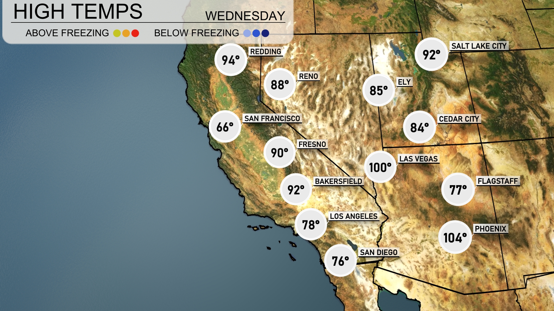 Tomorrow in the Southwest, Phoenix is heating up to a scorching 104 degrees. Las Vegas will also feel the heat, reaching 100 degrees, marking a notable spike above average for this time of year. In Bakersfield, temperatures are expected to hit 92 degrees, while Fresno warms up to 90. San Diego will enjoy a milder day at 76 degrees, remaining relatively cooler along the coastal areas.