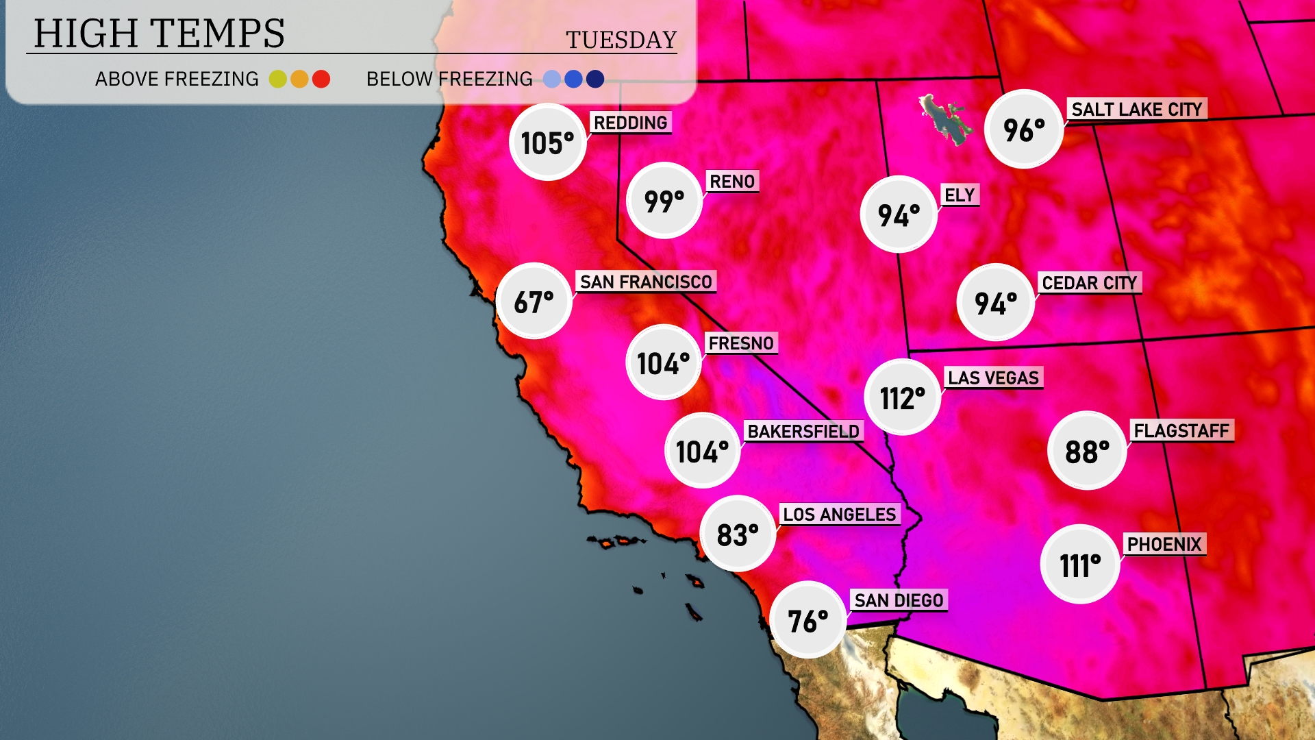 Tomorrow in Las Vegas, expect a scorching high of 112 degrees, significantly above average for this time of year. Phoenix will also feel the heat with a high of 111 degrees, while Flagstaff remains cooler at 88 degrees. In California, Bakersfield and Fresno both reach 104 degrees, emphasizing the heatwave settling over the region. San Francisco will experience a mild day with a high of 67 degrees, contrasting sharply with the inland areas.