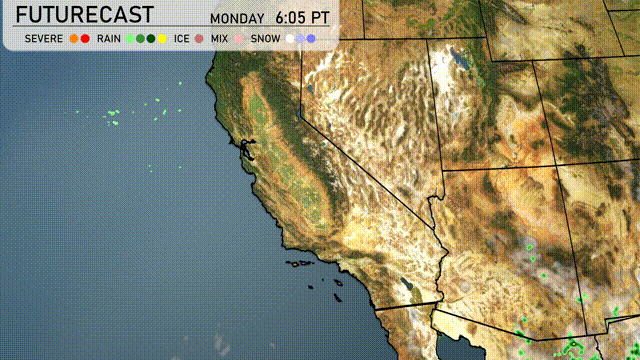The Southwest region is experiencing a mix of weather conditions today. The radar shows rain concentrated along the central California coast, with showers extending from San Francisco down to Los Angeles, bringing some much-needed moisture. Snow is appearing over the mountains near Salt Lake City, creating beautiful wintry scenes. Clear skies prevail over Las Vegas, Phoenix, and Flagstaff, maintaining dry conditions in those areas.