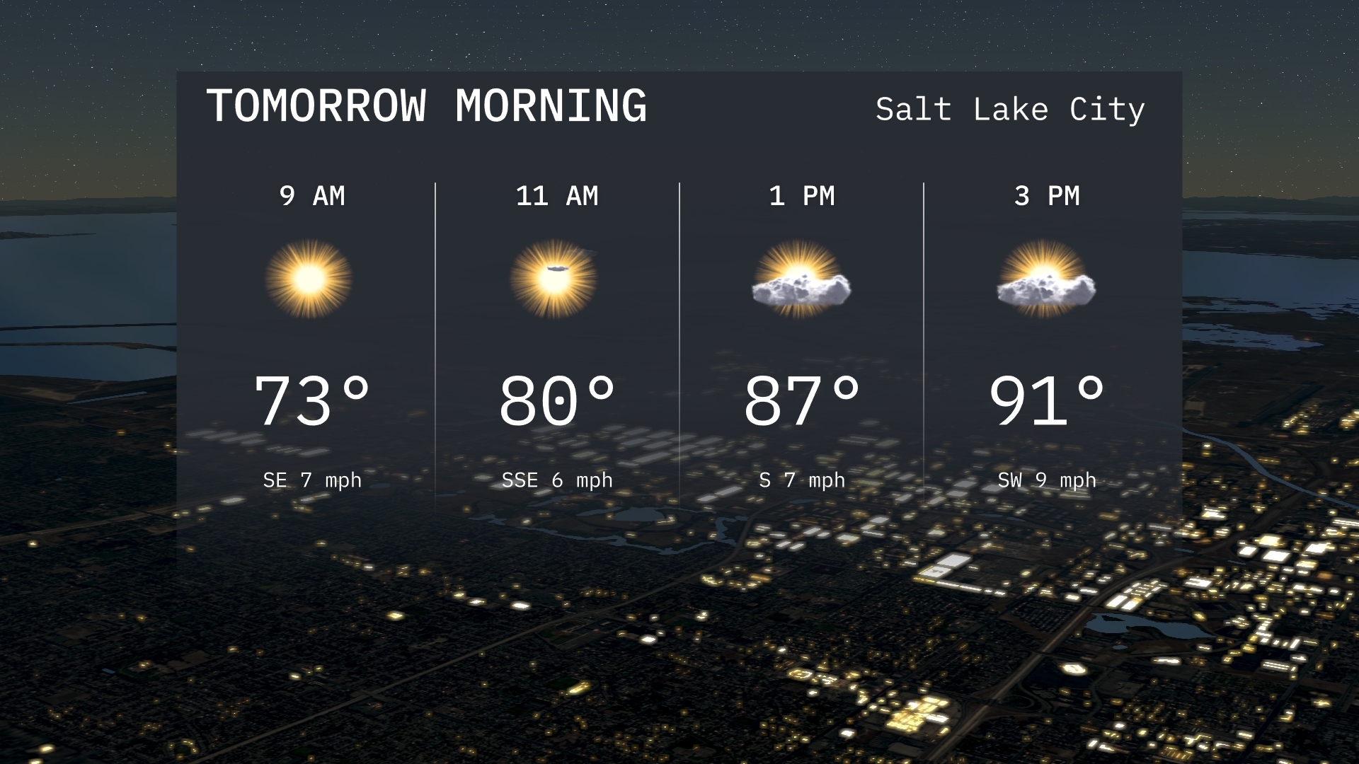 For tomorrow morning in Salt Lake City, expect sunny skies beginning at 9 AM with temperatures at 73 degrees and a light southeast wind. By 11 AM, the weather remains clear and the temperature will rise to 80 degrees with a south-southeast wind.