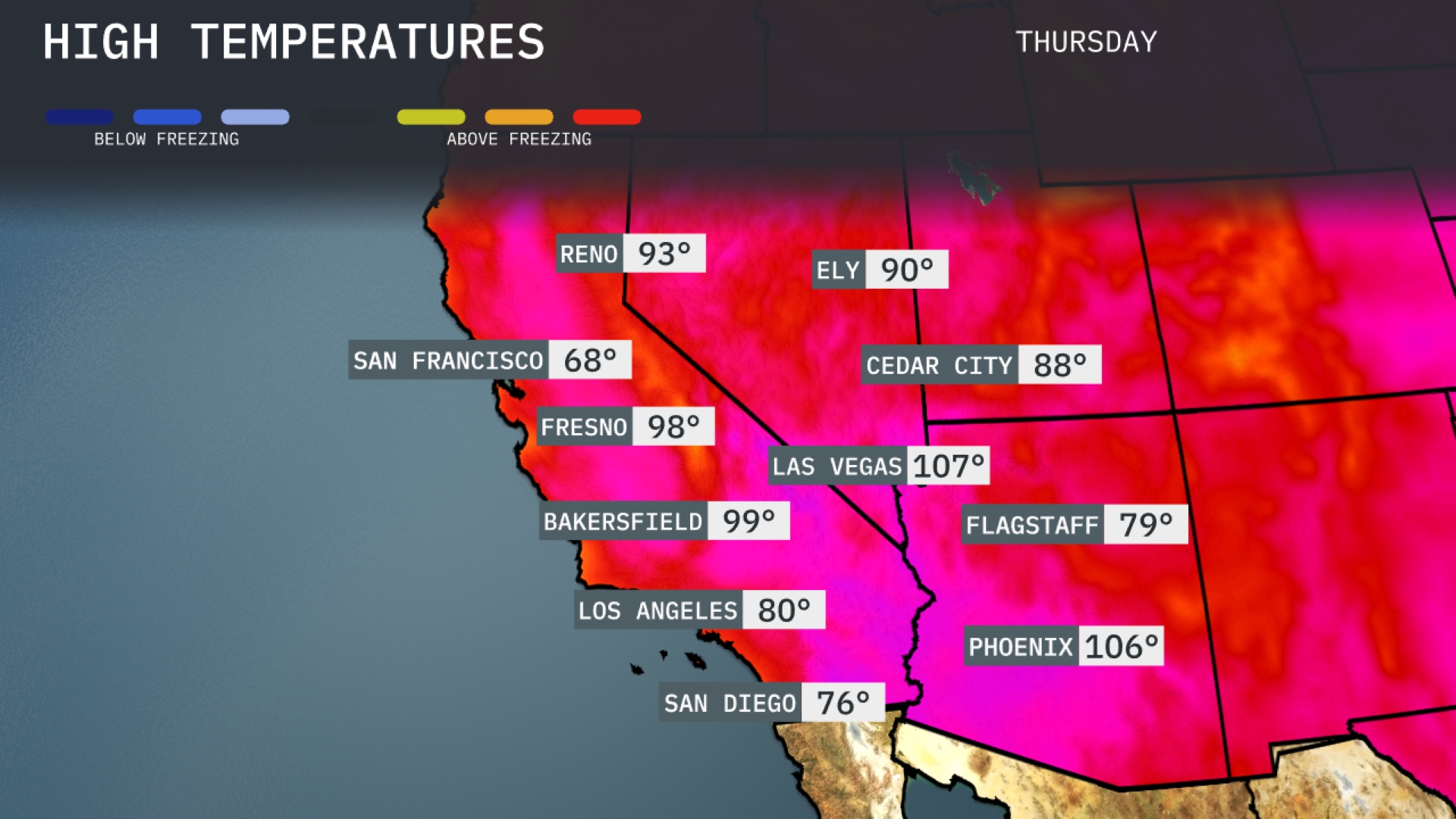 Tomorrow in Las Vegas, expect a scorching high of 107 degrees, well above average for this time of year. Phoenix will stay hot, reaching a high of 106 degrees, keeping in line with the persistent heat wave affecting the region. In Fresno, temperatures soar to 98 degrees, while further south in Bakersfield, highs are anticipated to hit 99. Los Angeles will experience a milder day at 80 degrees, and San Diego is slightly cooler at 76.