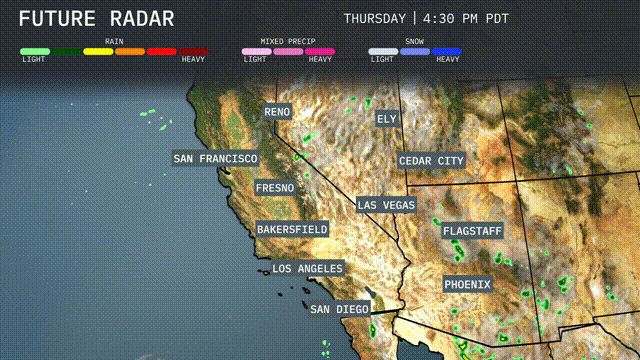 The radar for the Southwest region shows rain showers over San Francisco moving southeastward. Reno is currently experiencing mixed precipitation, while light snow flurries are noted in the Ely vicinity. Dry and clear conditions prevail in Las Vegas and Phoenix, providing a reprieve from any wet weather for now. Clouds are gradually thickening over Los Angeles and San Diego, indicating potential showers later in the day.