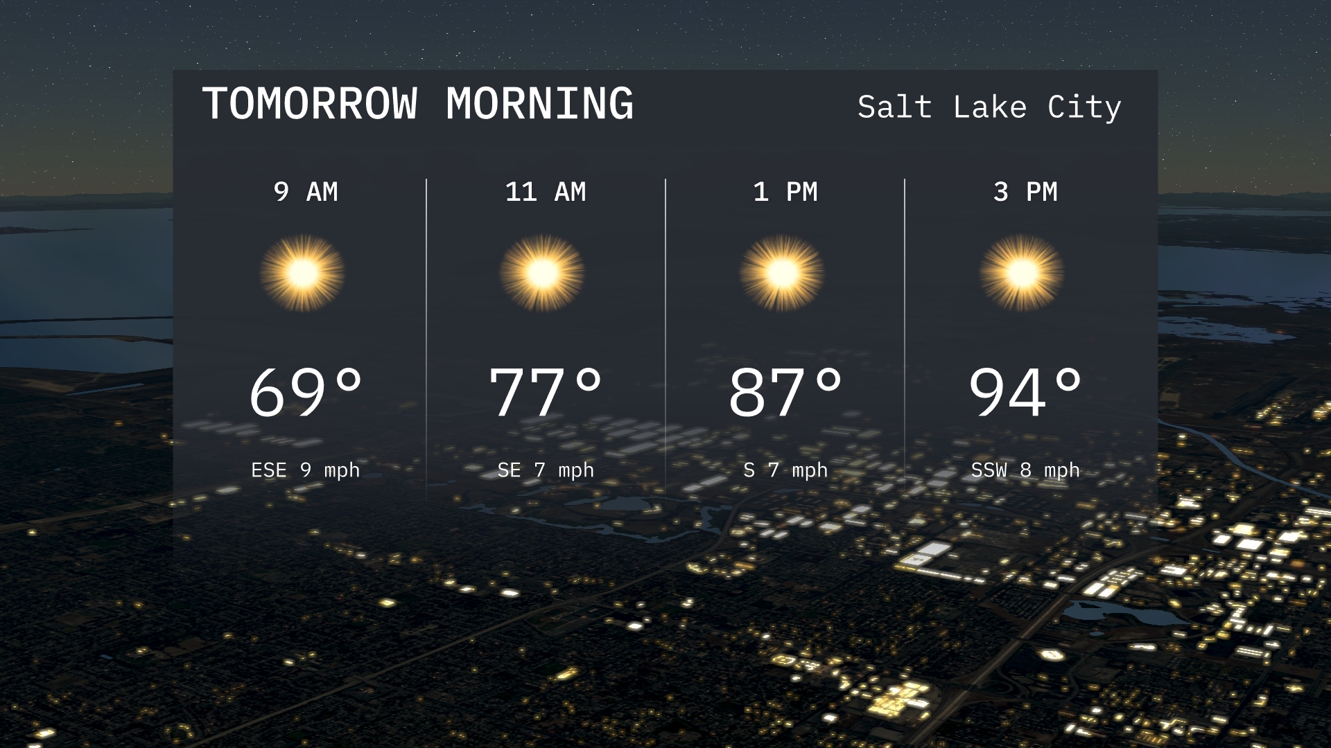 Tomorrow in Salt Lake City: Expect a sunny morning with temperatures starting at 69°F, climbing to 77°F by midday. Full details on our blog!