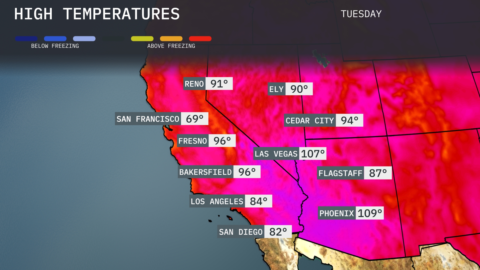 Tomorrow in Las Vegas, expect a scorching high of 107 degrees, continuing the trend of above-average temperatures in the region. Phoenix will see even hotter conditions with a high reaching 109 degrees. Over in Fresno and Bakersfield, temperatures will be warmer than typical, peaking at 96 degrees. San Diego can anticipate a pleasant high of 82 degrees, which is a bit below the seasonal norm. San Francisco remains cooler at 69 degrees, showcasing the varied climate across the Southwest.
