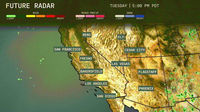 A line of rain is sweeping through Central California with heavier showers near Fresno and Bakersfield, offering some relief to the region. San Francisco and Los Angeles remain clear with dry conditions persisting. Cedar City and Flagstaff can anticipate cloudy skies with a chance of light precipitation moving in later tonight.