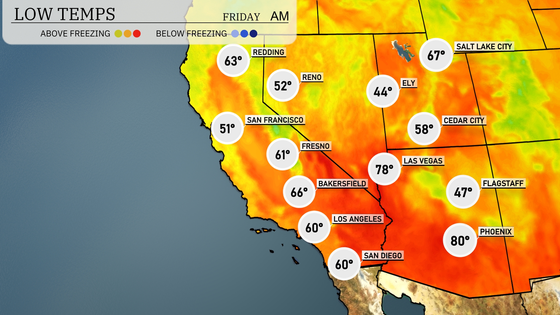Tonight, Las Vegas will drop to a mild 78 degrees. In contrast, Flagstaff is expecting a much cooler low of 47 degrees. San Francisco will see a low of 51, while Los Angeles holds steady at 60 degrees. Fresno is forecasting a low of 61, offering a relatively warm night for the region.