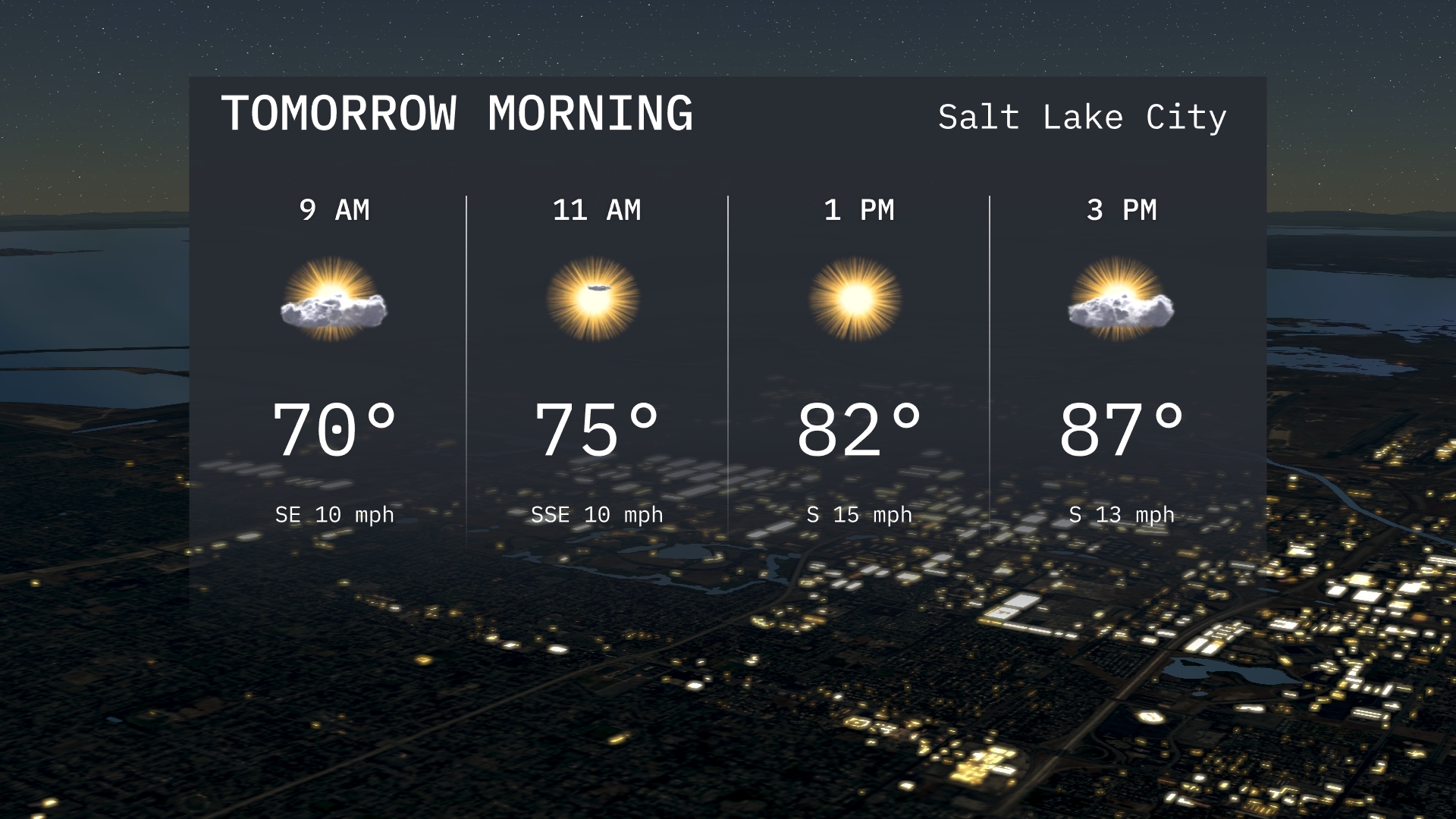 Tomorrow morning in Salt Lake City begins with mostly sunny skies and a temperature around 70 degrees at 9 AM. As the morning progresses, temperatures will rise to 75 degrees by 11 AM. Winds will be gentle from the southeast.