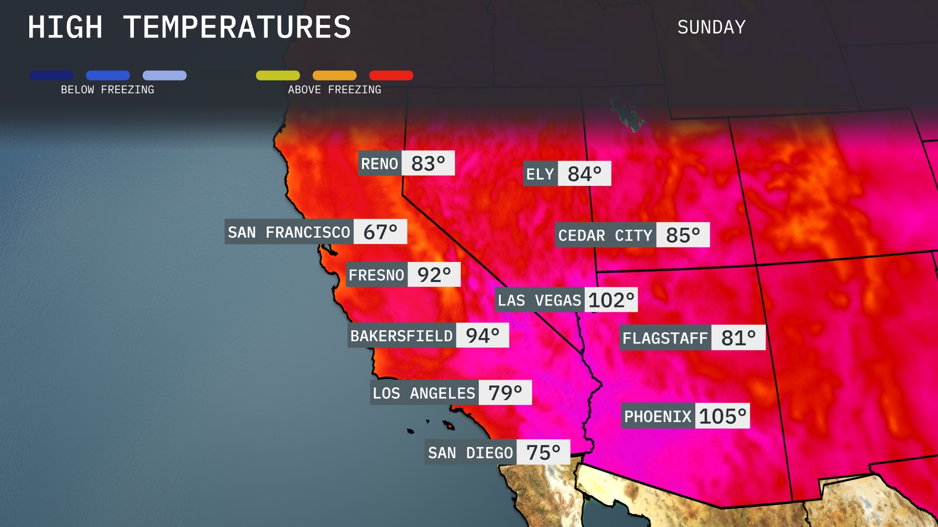 Tomorrow in Phoenix, expect a sizzling high of 105 degrees, well above average for this time of year. Las Vegas will be hot too, reaching 102 degrees, reflecting similar trends seen throughout the region. Bakersfield warms up to 94 degrees, while Fresno is set for a high of 92 degrees. San Diego will enjoy a more moderate 75 degrees, offering a nice contrast to the inland heat.