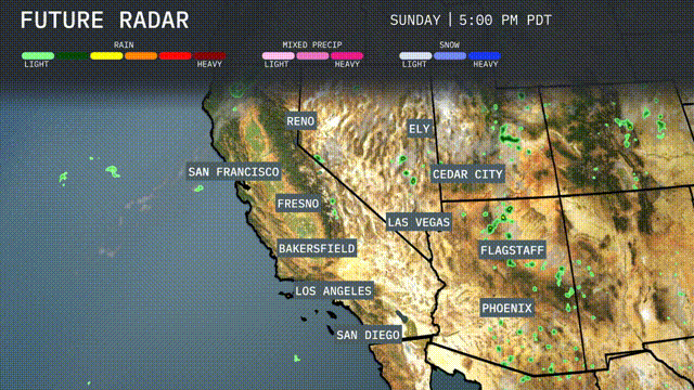 Showers are forecasted to move across Northern California from Sunday evening into Monday, with areas such as San Francisco and Fresno receiving periods of rain that may cause afternoon commuting delays. Southern California remains dry in cities like Los Angeles and San Diego. Expect clear skies across the deserts, with warm daytime temperatures in the low 90s for Las Vegas and Phoenix. The weather in Ely will stay dry until later in the week when some light precipitation may develop.