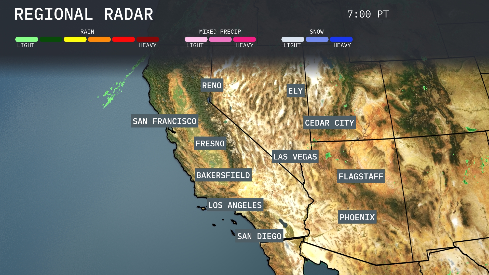 A robust weather system is creating a mixed precipitation event near Reno, with a transition to snow expected in the mountains. Light rain is moving across San Francisco and entering the central valleys, while Bakersfield is cloudy. Ely is set for cooler conditions. Las Vegas and Phoenix remain dry.