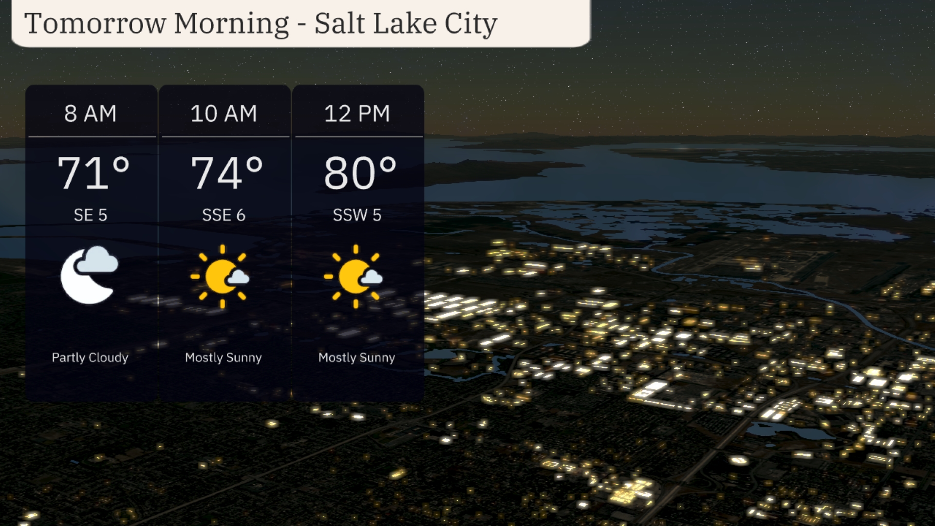 For tomorrow morning in Salt Lake City, temperatures will start at 71 degrees at 8 AM with partly cloudy skies. By 10 AM, expect temperatures to rise to 74 degrees with mostly sunny conditions and a gentle south-southeast wind at 6 mph. As you move into the late morning, temperatures will reach 80 degrees under mostly sunny skies with a south-southwest wind at 5 mph.