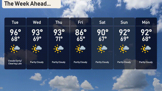 Here’s your 7-day forecast for Salt Lake City: Tuesday: Clouds will clear early, paving the way for a warm day with highs around 96 degrees and a low of 68 degrees. Wednesday: Expect partly cloudy skies with temperatures reaching a high of 93 degrees and the low dipping to 69 degrees. Thursday: The warmth continues with a high of 93 degrees. Overnight, expect a low around 71 degrees under partly cloudy skies. Friday: Partly cloudy conditions persist, with a high of 86 degrees and a cooler evening low near 65 degrees. Saturday: A mix of sun and clouds with temperatures peaking at 90 degrees and dropping to 67 degrees at night. Sunday: The day will be partly cloudy again, maintaining a high of 92 degrees and a low around 69 degrees. Monday: The week wraps up with another partly cloudy day. Expect highs near 92 degrees and lows around 68 degrees.