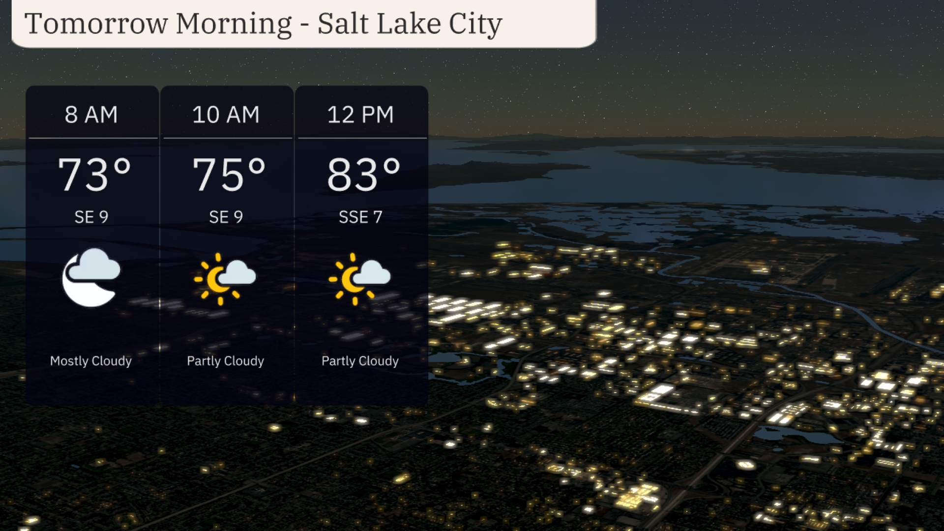 Expect a mostly cloudy start to your morning in Salt Lake City with temperatures around 73 degrees at 8 AM and a light wind from the southeast at 9 miles per hour. By 10 AM, skies become partly cloudy as temperatures rise to 75 degrees with the southeast wind continuing at 9 miles per hour. As the morning progresses, temperatures will climb to 83 degrees by noon with partly cloudy skies and a gentle breeze from the south-southeast at 7 miles per hour.