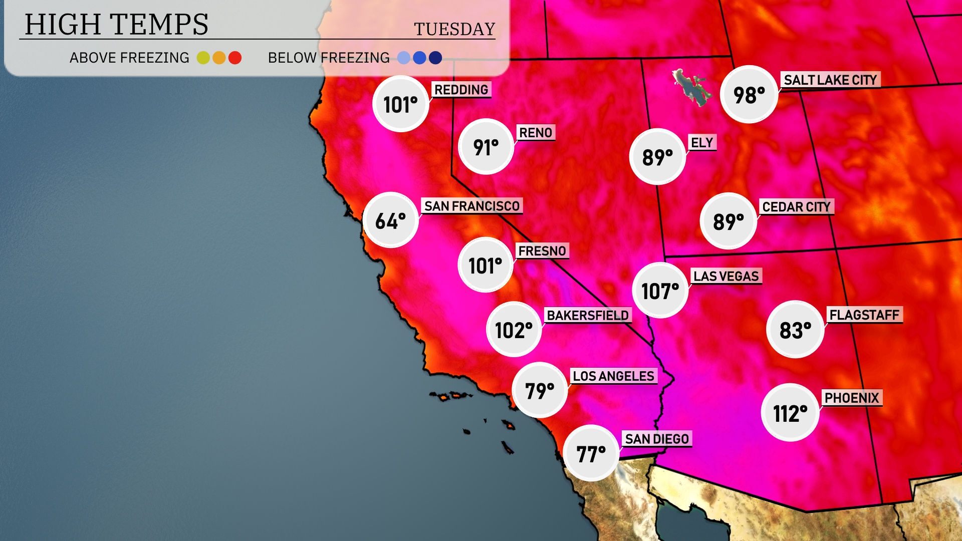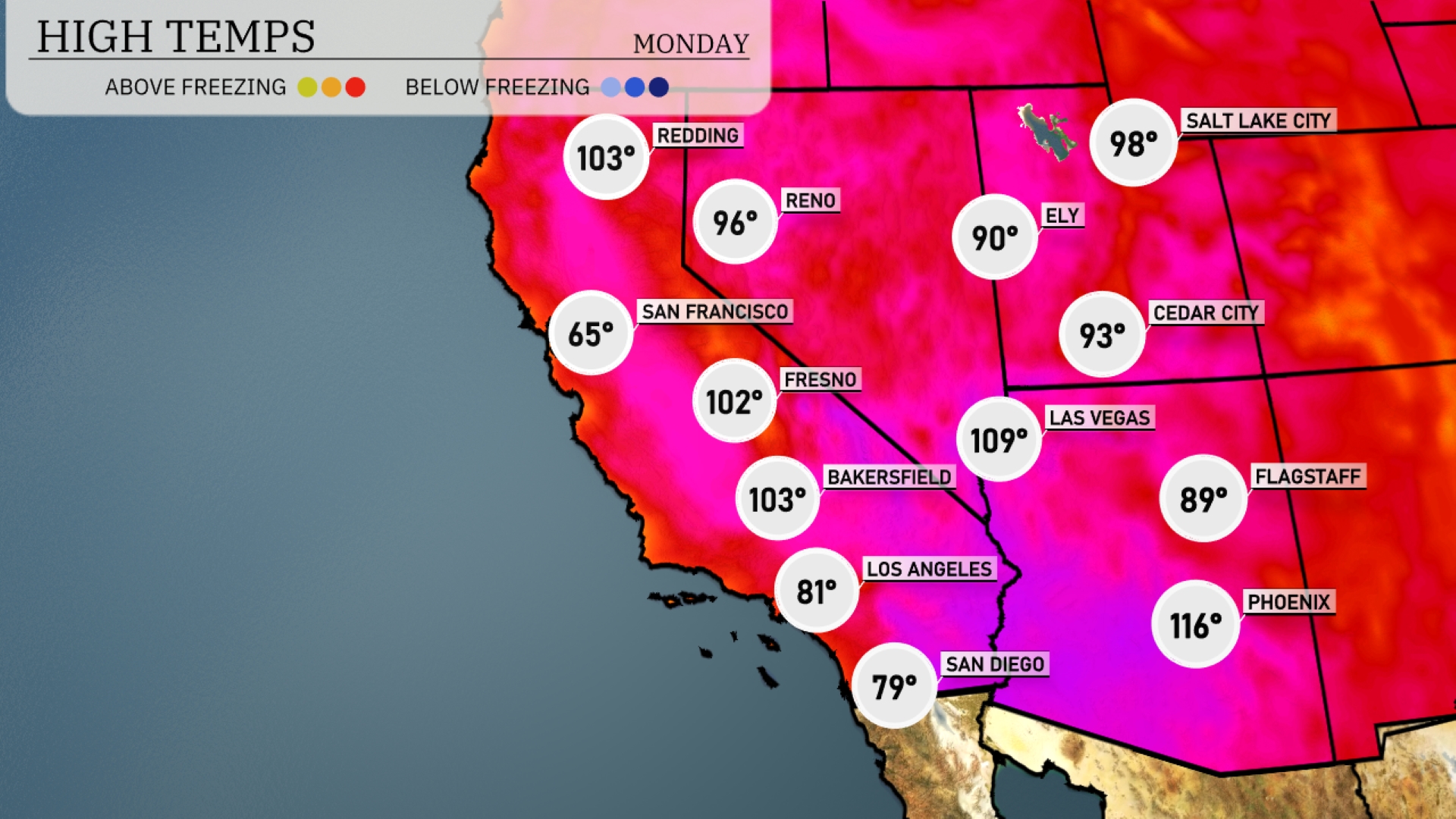 In the Southwest, temperatures are soaring today. Phoenix is leading the way with a sizzling high of 116 degrees, while Las Vegas is experiencing a warm 109. Flagstaff is cooler at 89 degrees, providing a refreshing contrast to the valley heat. Over in Los Angeles, the temperature is a more comfortable 81, but Bakersfield is rising to a hot 103. San Francisco remains the coolest in the region with a high of 65 degrees, highlighting the dramatic temperature variations across the area.