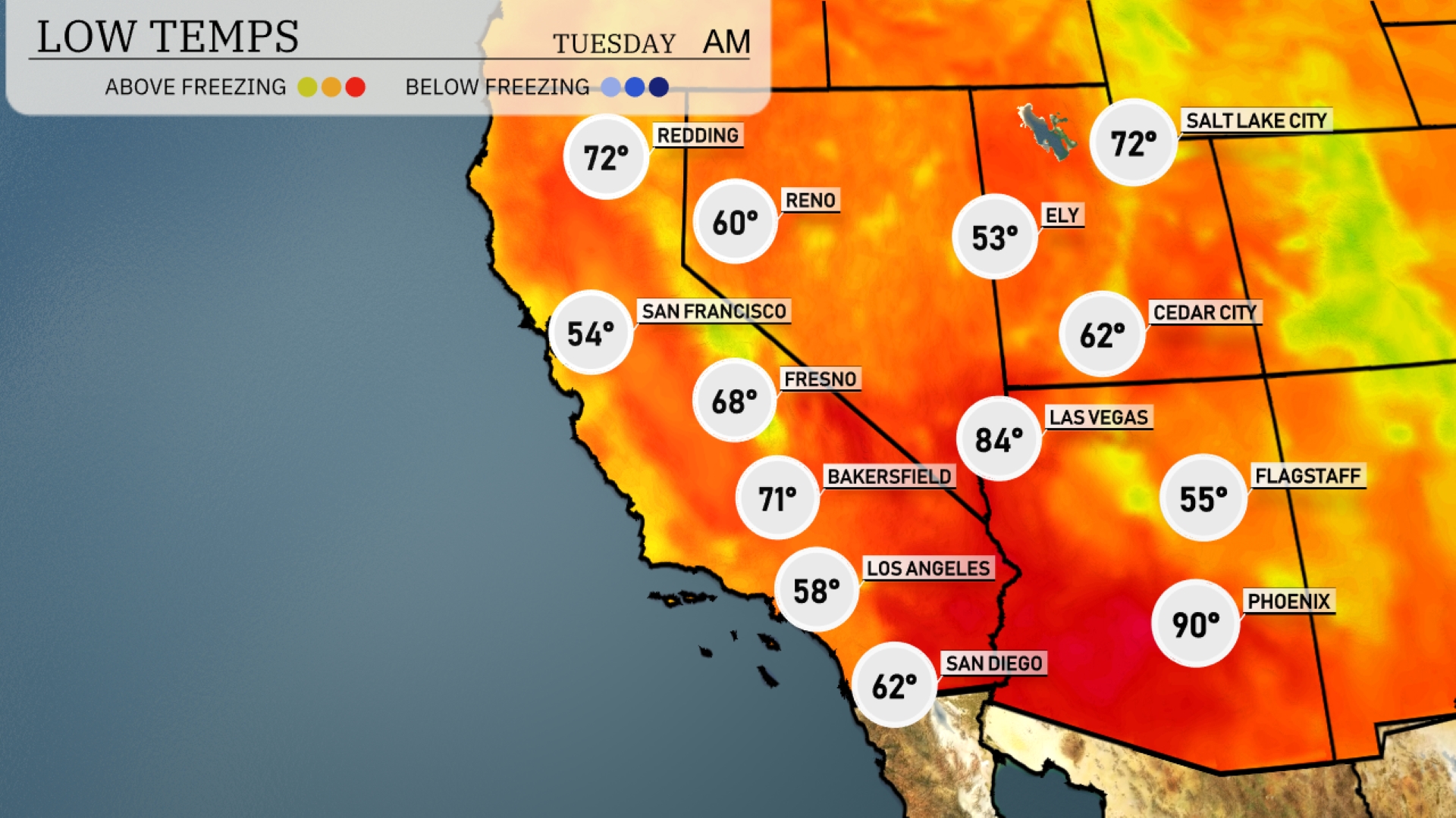 Tonight in the Southwest, temperatures will dip considerably in several key cities. Las Vegas is forecasted to fall to 84 degrees, while Phoenix will remain warm at 90 degrees. Flagstaff will see cooler conditions with a low of 55 degrees, and Los Angeles will drop to 58 degrees. San Francisco can expect a refreshing low of 54 degrees.