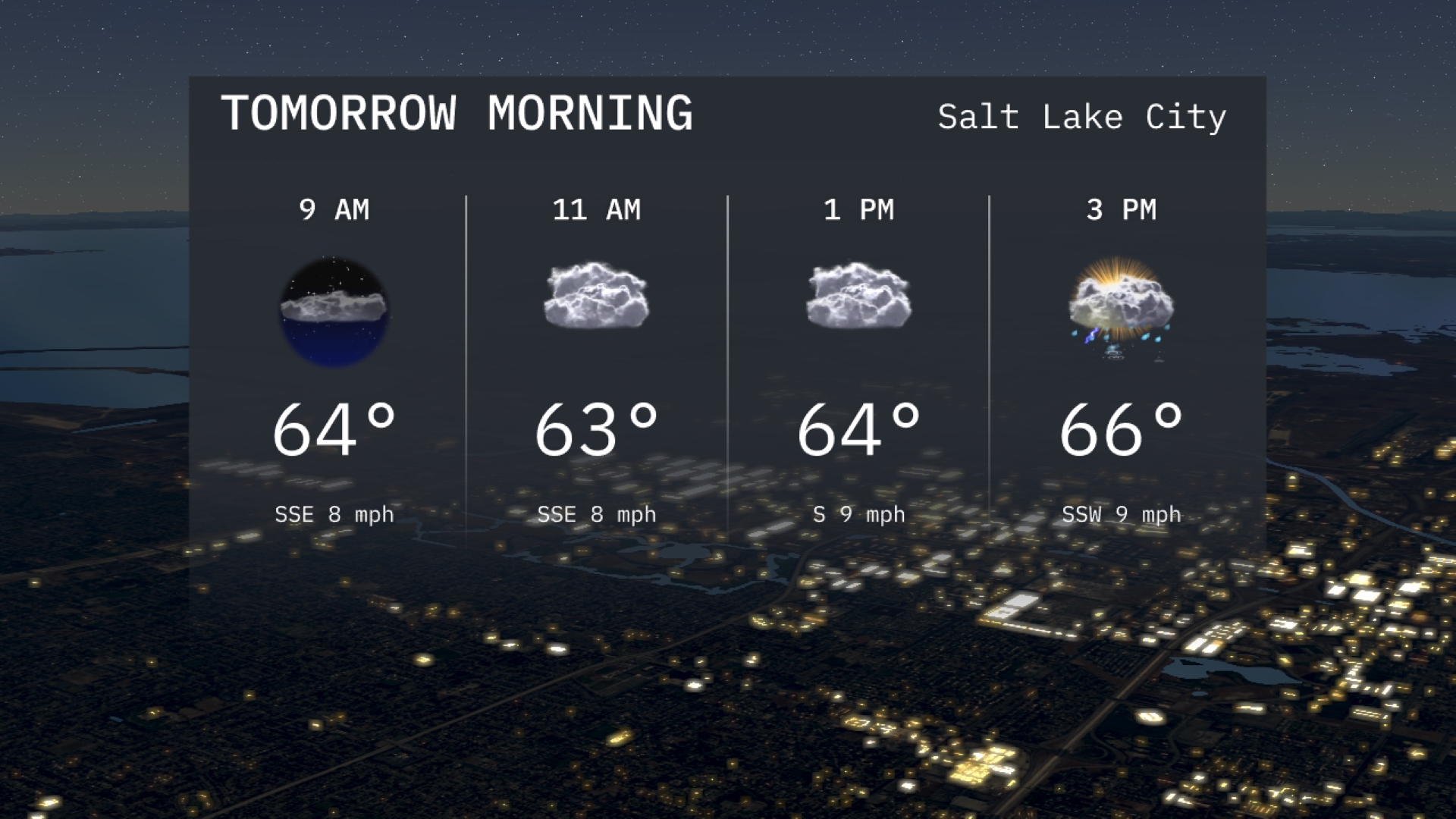 Begin your morning in Salt Lake City with mostly cloudy skies and temperatures around 64 degrees at 9 AM. Winds will blow from the south-southeast at 8 miles per hour, offering a gentle breeze. By 11 AM, expect a slight uptick to 63 degrees as cloud cover continues, keeping conditions mild and comfortable.
