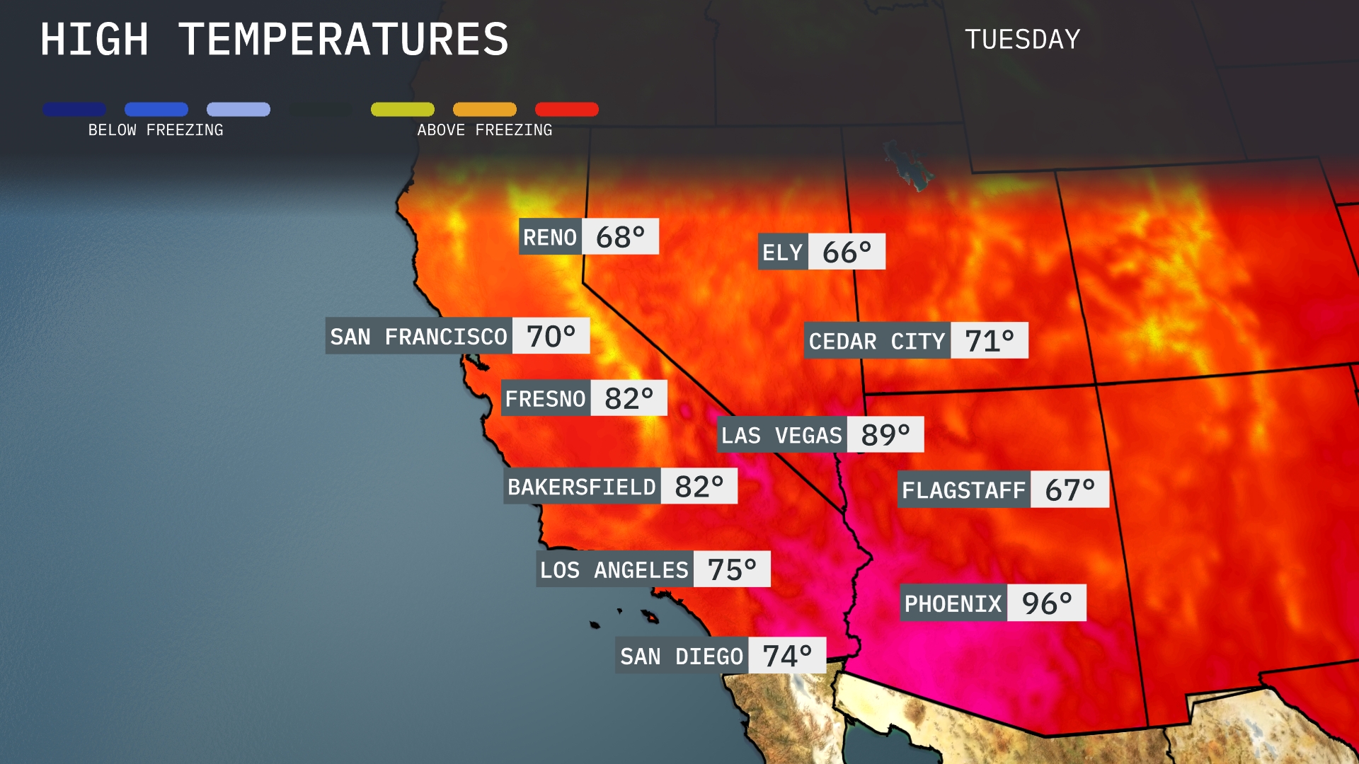 Tomorrow, Phoenix is set to sizzle with a high of 96 degrees, well above average for this time of year. Las Vegas will also experience a warm day, reaching 89 degrees. Bakersfield and Fresno are expected to see comfortable highs of 82 degrees each. Meanwhile, Los Angeles will enjoy a mild 75 degrees. San Diego will be slightly cooler at 74 degrees, making for a pleasant afternoon along the coast.