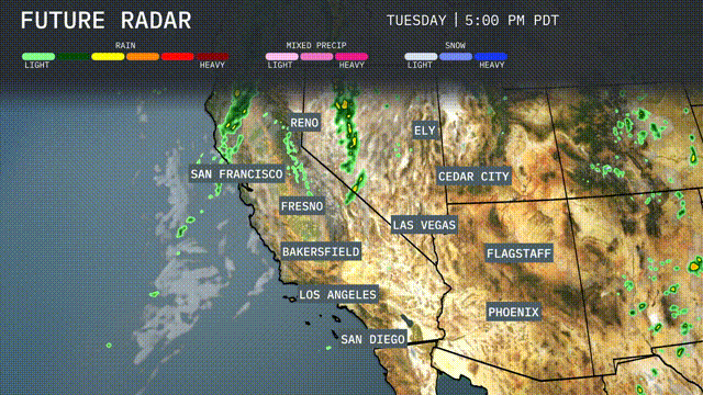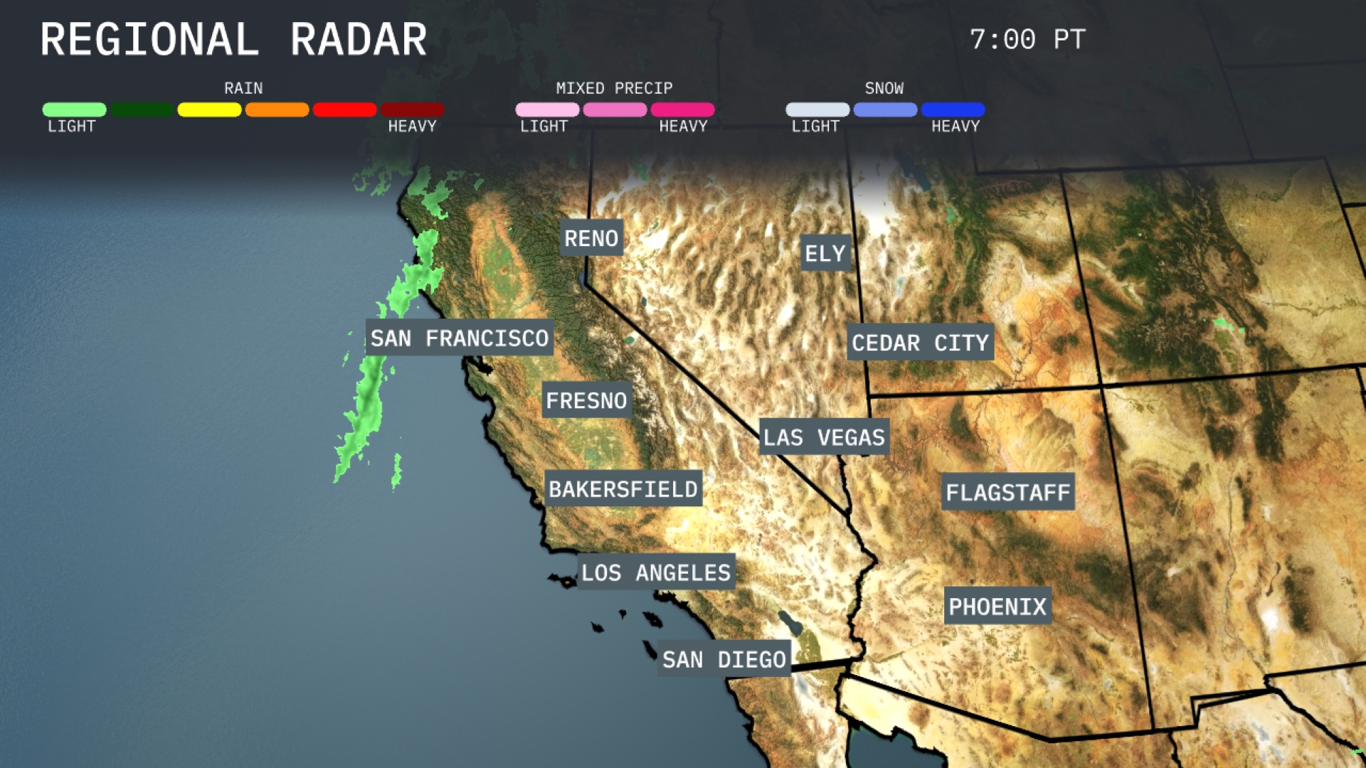 Rain is moving into the San Francisco area from the Pacific Ocean, bringing welcomed precipitation along the California coast. Light showers are stretching towards Fresno, with additional clouds seen around Los Angeles, although remaining dry there for now. Ely and Cedar City are under clear skies, while Flagstaff and Las Vegas experience dry conditions without any current weather activity. Phoenix continues to enjoy clear skies with no precipitation expected.