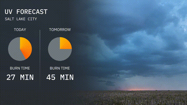 Today’s UV index in Salt Lake City is moderate, with a burn time of 27 minutes under direct sunlight. Expect a low UV index tomorrow as cloud cover and potential storms will greatly reduce sun exposure, with no significant burn risk. Make sure to plan accordingly, and prioritize staying covered during these intervals!